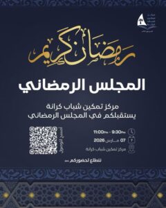 المجلس الرمضاني مركز تمكين شباب كرانة يستقبلكم في المجلس الرمضاني من الساعة 11:00 مساءً إلى الساعة 9:30 مساءً 2026 07 مارس مركز تمكين شباب كرانة نتطلع لحضوركم ...