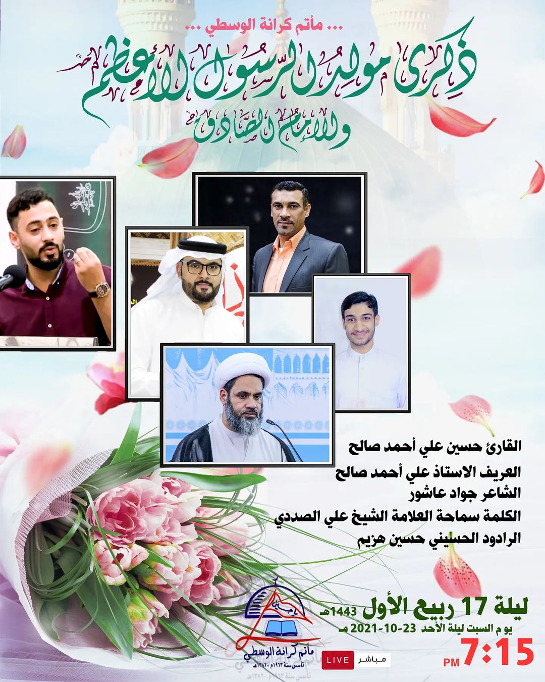 الرادود الحسيني حسين هزيم ليلة 17 ربيع الأول : يوم السبت ليلة الأحد 23-10-2021 م VILLN PM 7:15 1443 هـ ماتم كرانة الوسطي مباشر