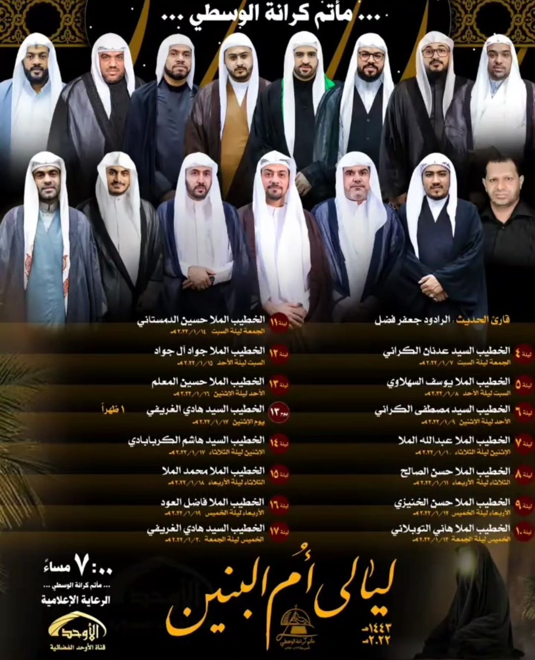 ماتم كرانة الوسطي يقيم ليالي ام البنين وعلى مدى ١٤ ليلة وعتمد جميع الخطباء لهذه الليلي من الشباب