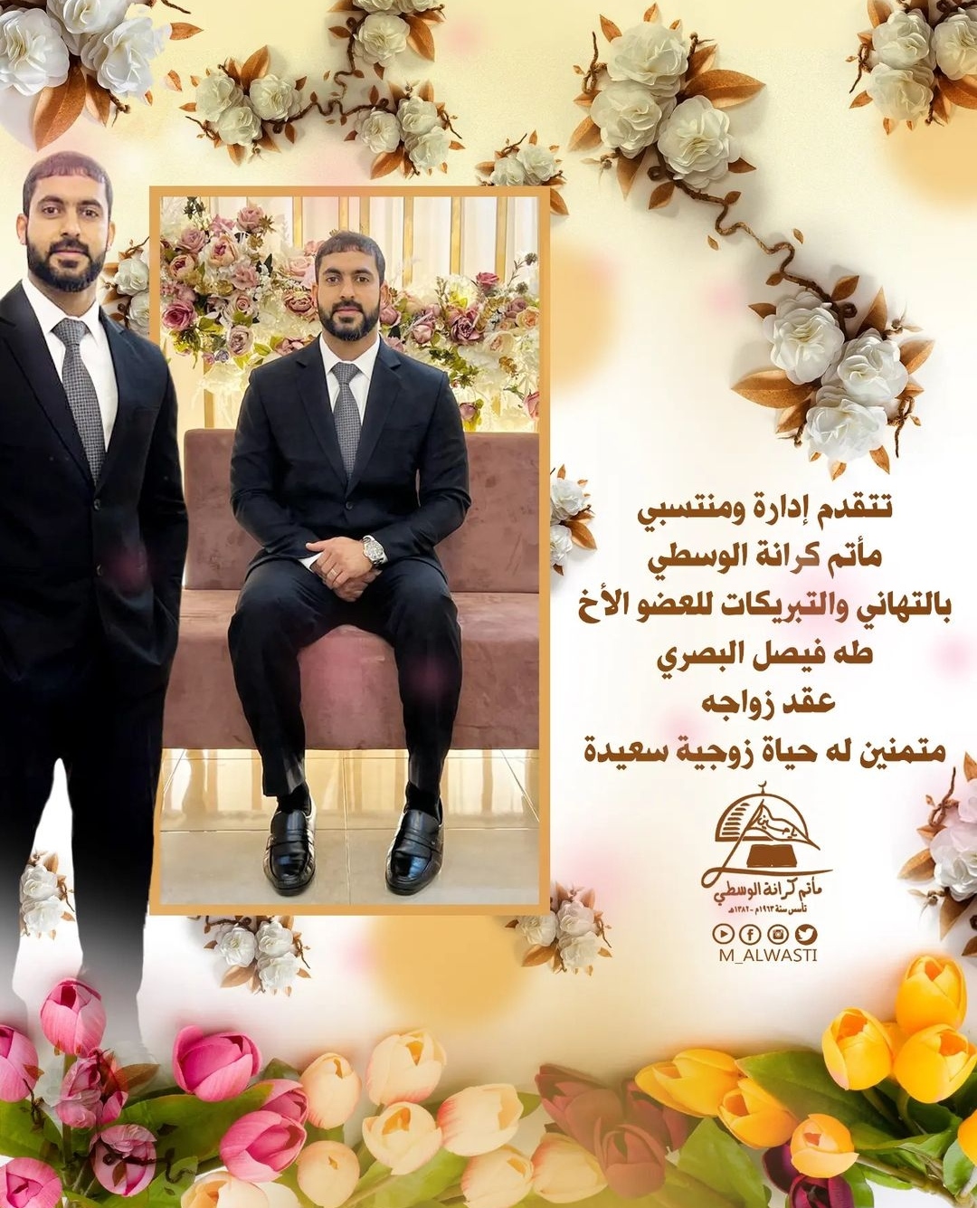 تتقدم إدارة ومنتسبي مأتم كرانة الوسطي بالتهاني والتبريكات للعضو الأخ طه فيصل البصري عقد زواجه