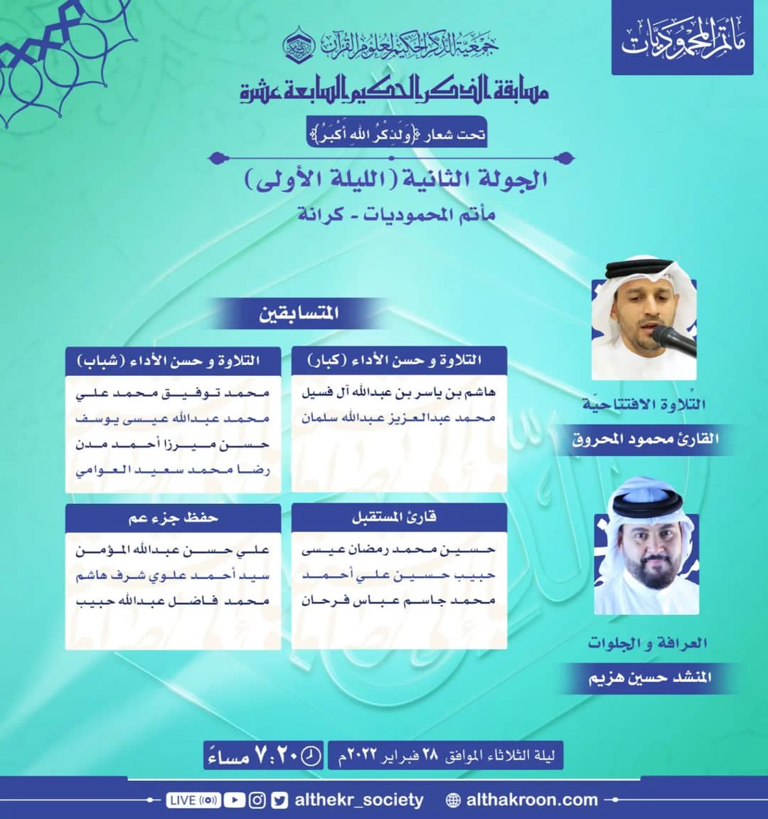 الجولة الثانية من التصفيات النّهائية لمسابقة الذكر الحكيم الشابعة عشرة والتي تنطلق ليلة الثلاثاء الموافق ۲۸ فبرایر ۲۰۲۲م بمأتم المحموديات بكرانة.