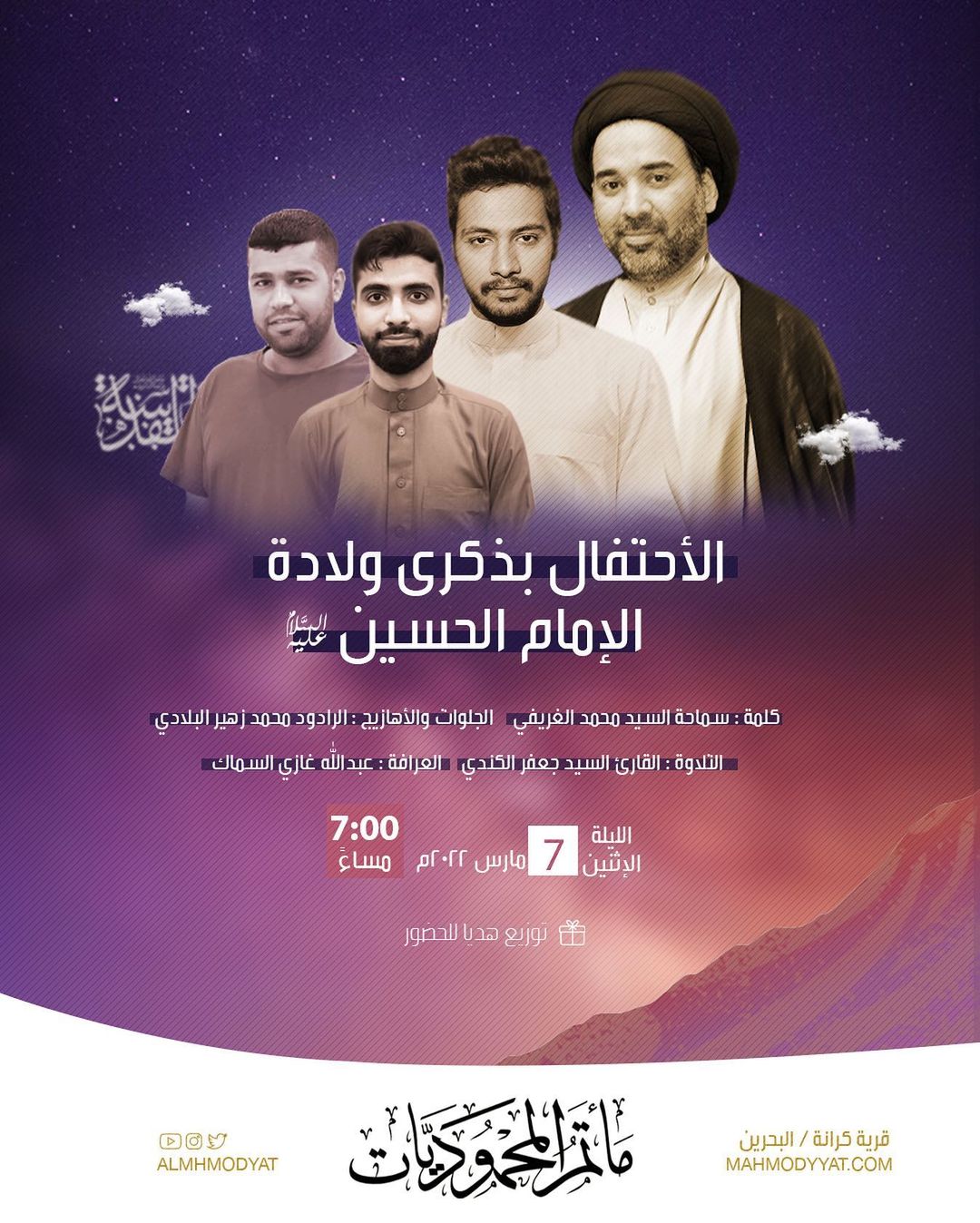 كلمة : سماحة السيد محمد الغريفي الجلوات والأهازيج : الرادود محمد زهير البلادي التلاوة : القارئ السيد جعفر الكندي العرافة : عبد الله غازي السماك