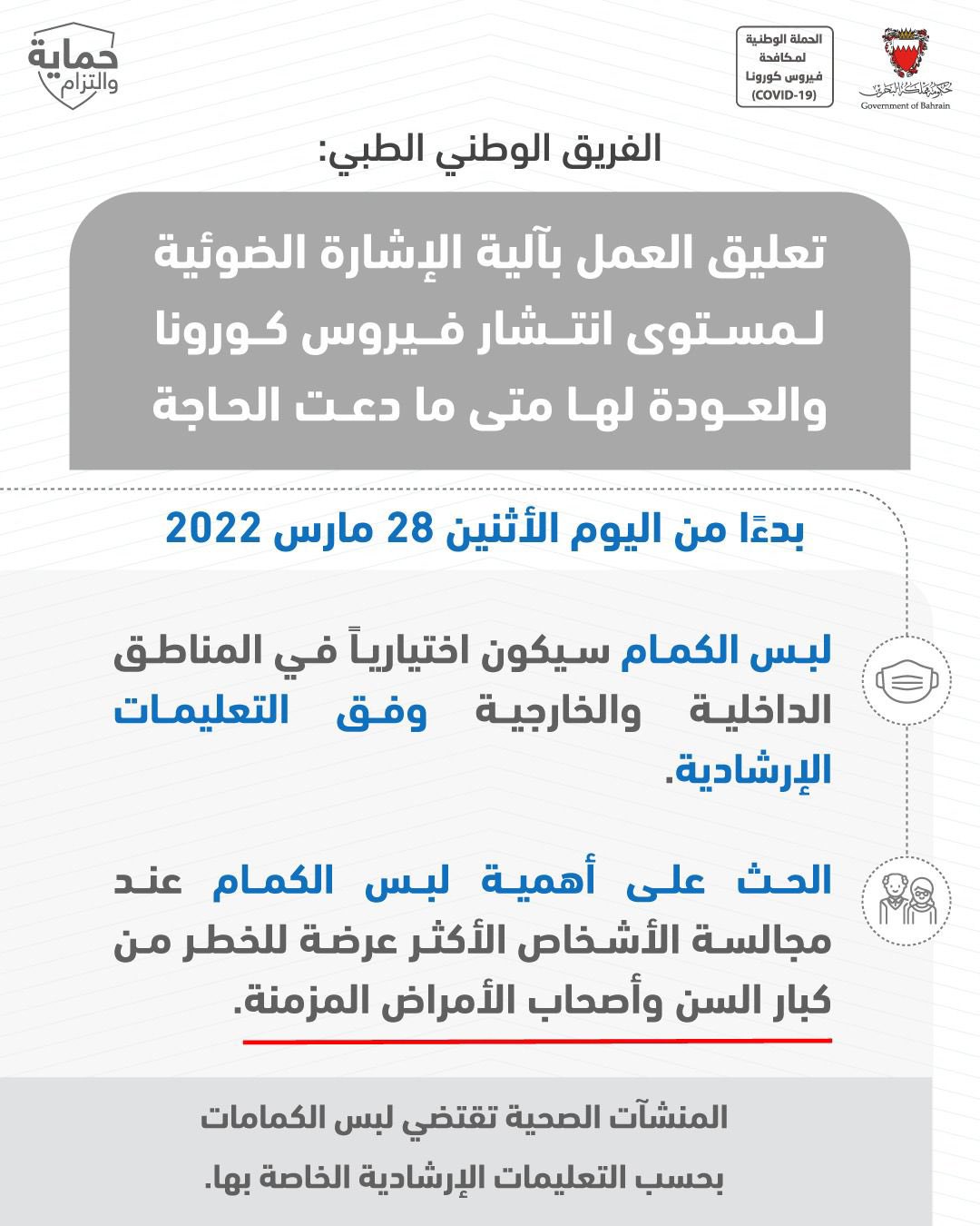 ‏الفريق الوطني الطبي: تعليق العمل بآلية الاشارة الضوئية لمستوى انتشار فيروس كورونا والعودة لها متى ما دعت الحاجة واختيارية لبس الكمامات في المناطق الداخلية والخارجية وفق التعليمات الإرشادية فقط بدءًا من اليوم الأثنين الموافق 28 مارس 2022