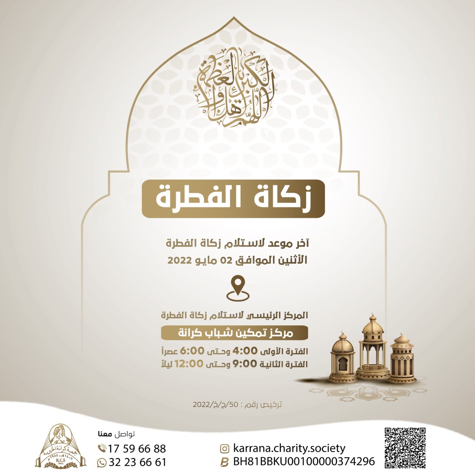 🔴 *تنويه :* آخر يوم لاستلام زكاة الفطرة يوم الأثنين الموافق *02 مايو 2022 م*