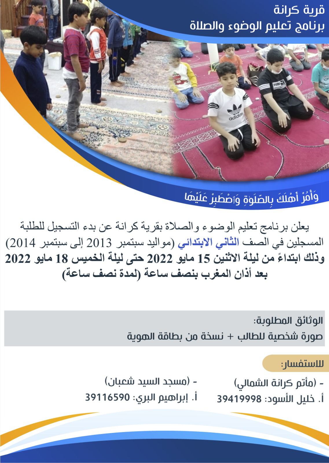 يعلن برنامج تعليم الوضوء والصلاة بقرية كرانة عن بدء التسجيل للطلبة المسجلين في الصف الثاني الابتدائي (مواليد سبتمبر 2013 إلى سبتمبر 2014) وذلك ابتداء من ليلة الاثنين 15 مايو 2022 حتى ليلة الخميس 18 مايو 2022 بعد أذان المغرب بنصف ساعة (لمدة نصف ساعة)