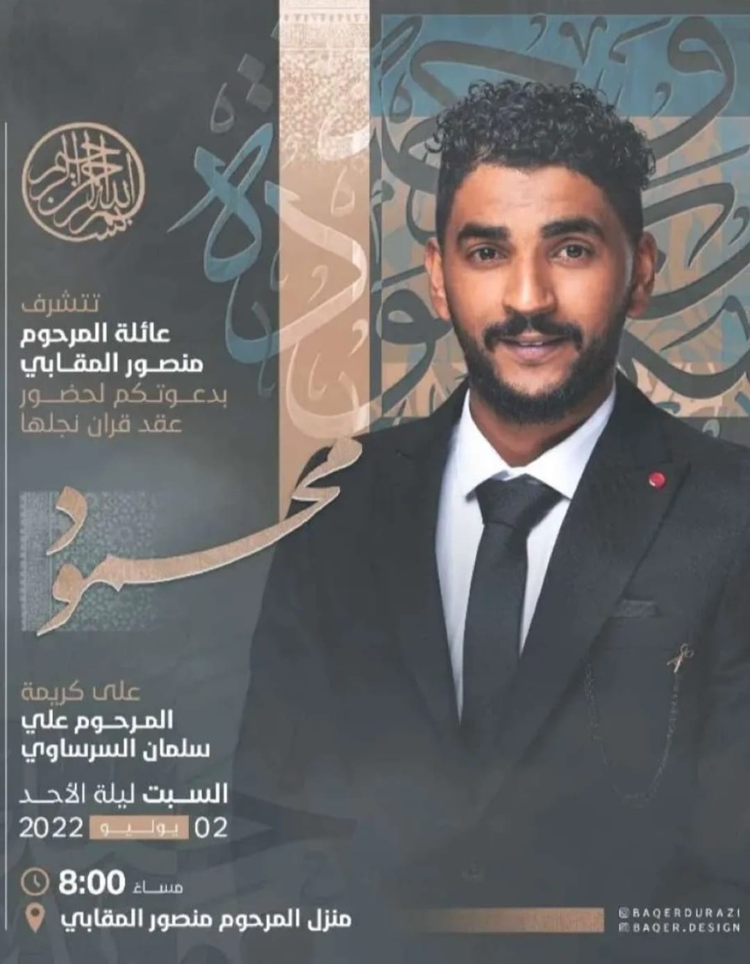 تتشرف عائلة المرحوم منصـور المقابي بدعوتكم لحضـور عقد قران نجلها