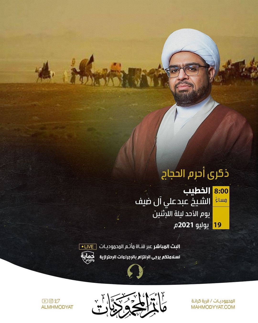 ذكرى أحرم الحجاج ذكرى أحرم الحجاج 8:00 الخطيب مساء الشيخ عبدعلي آل ضيف يوم الأحد ليلة الإثنين 19 يوليو 2021…