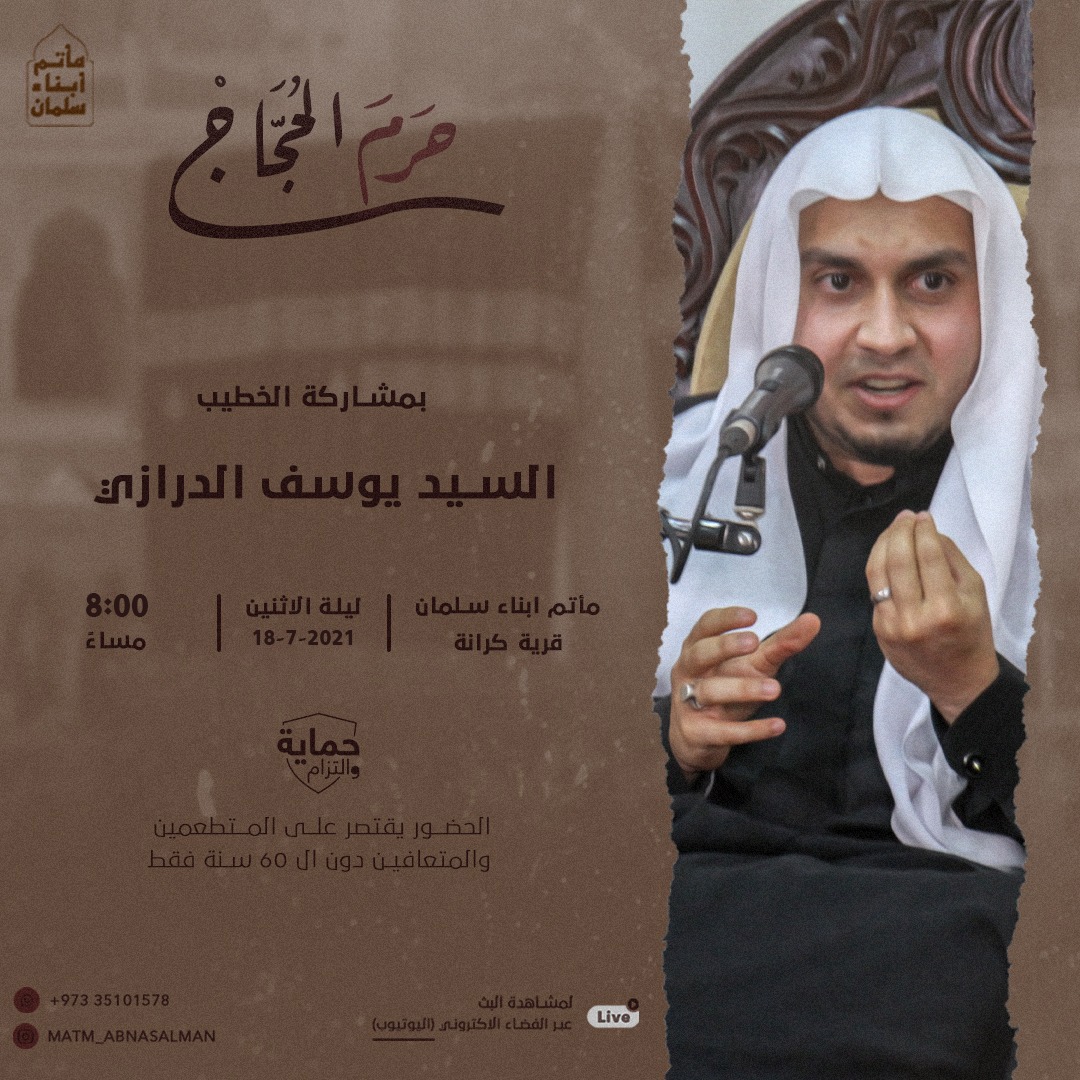 حرم الحجاج بمشاركة الخطيب السيد يوسف الدرازي الليلة الاثنين 8:00 مأتم ابناء السلمان قرية كرانة 18-7-2021 مساء حماية والتزام الحضور…