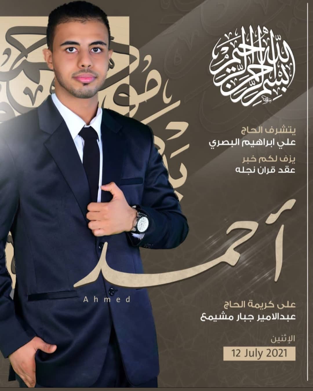 الحاج علي ابراهيم البصري يزف لكم خبر عقد قران نجله احمد على كريمة الحاج عبدالأمير عبد الجبار مشيمع الإثنين 12…