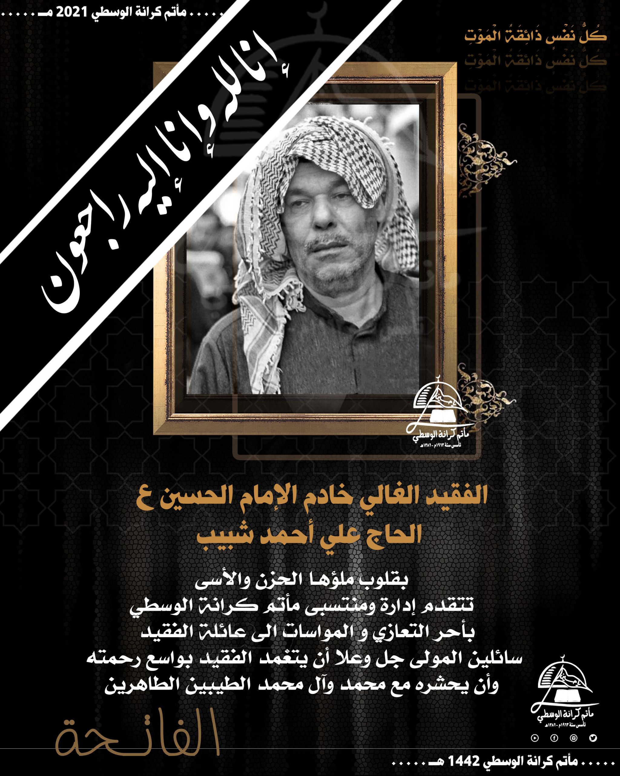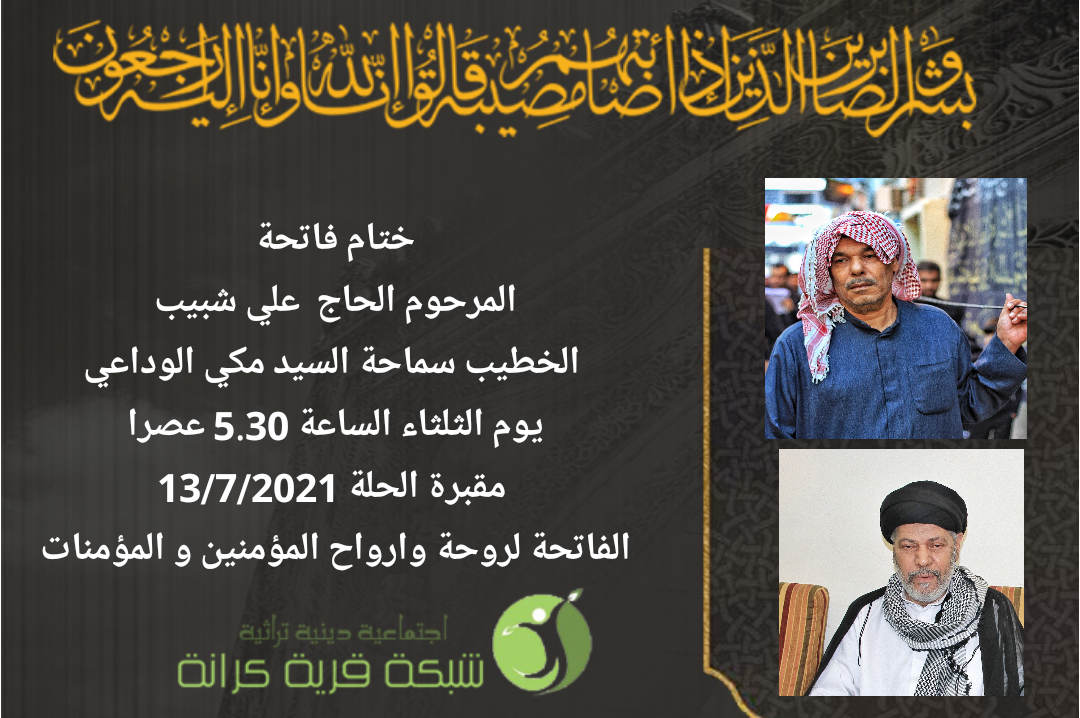 ختام فاتحة المرحوم الحاج علي شبيب الخطيب سماحة السيد مكي الوداعي يوم الثلثاء الساعة 5.30 عصرا مقبرة الحلة 13/7/2021 الفاتحة…