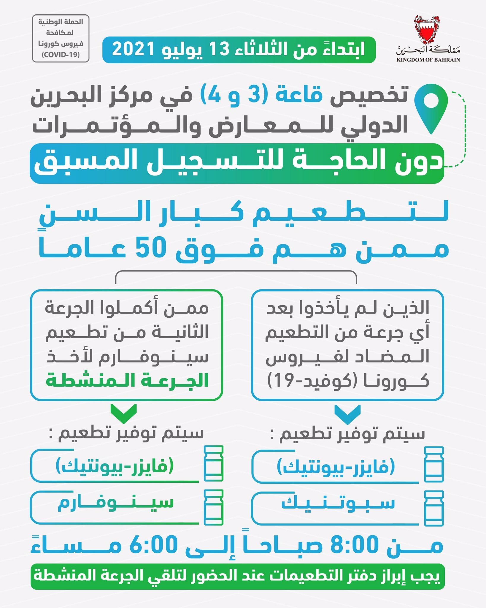 أعلنت وزارة الصحة أنه بدءًا من يوم الثلاثاء الموافق 13 يوليو 2021 سيتم تخصيص قاعتين بمركز البحرين الدولي للمعارض والمؤتمرات…