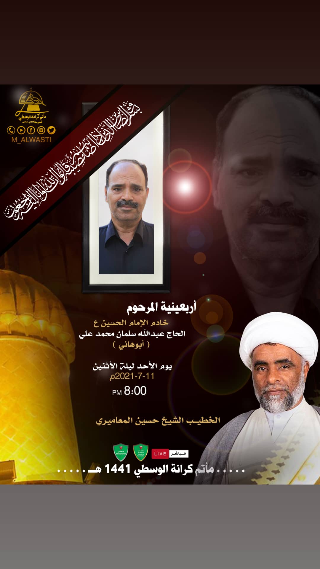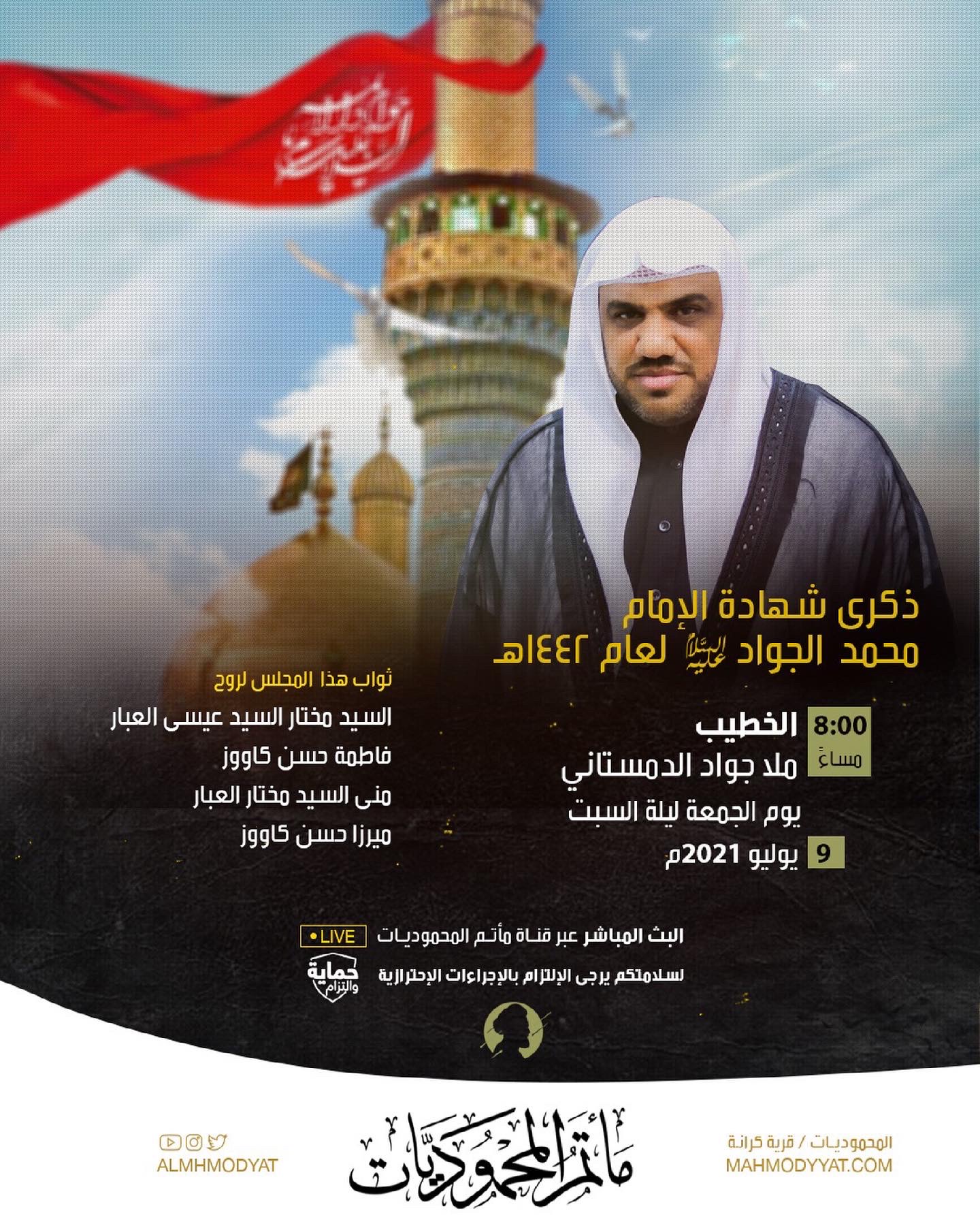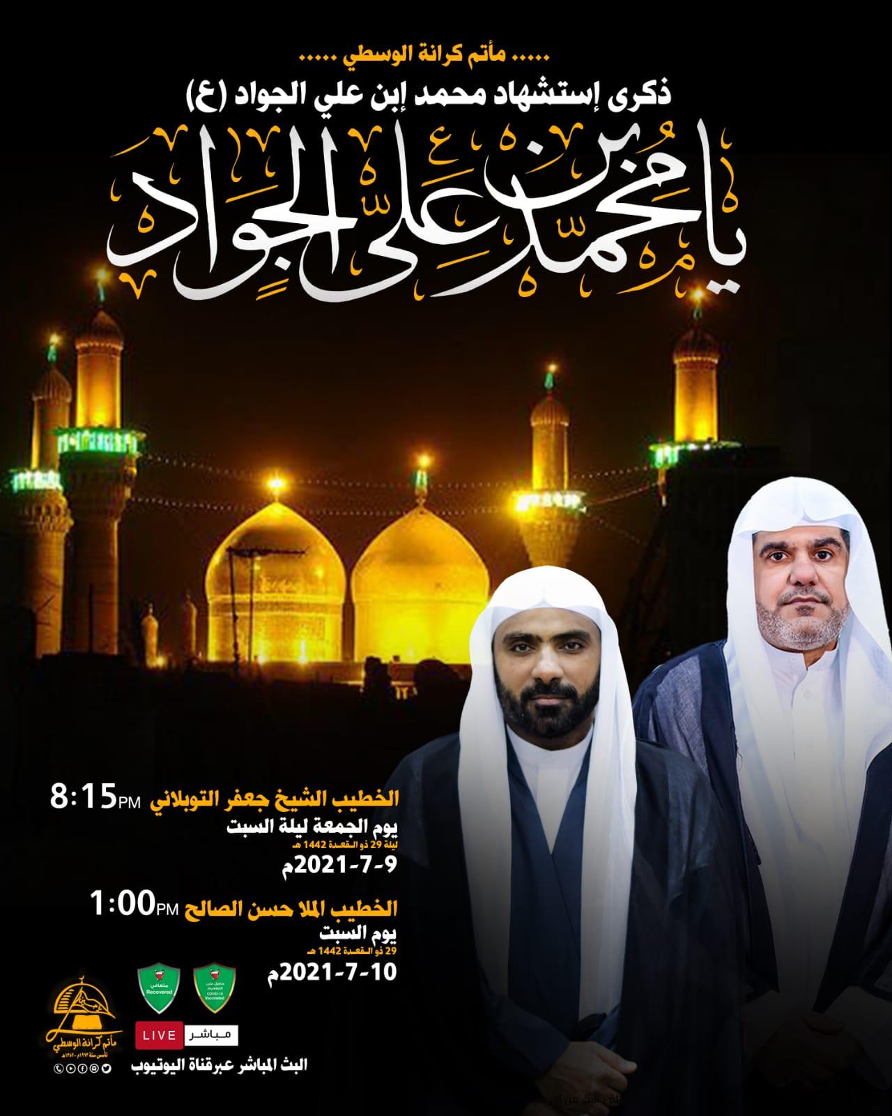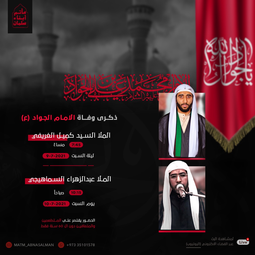 ذكرى وفاة الامام الجواد ( ع ) الملا السيد كميل الغريفي 7:45 ليلة السبت 9-7-2021 الملا عبدالزهراء السماهيجي 10:15 صباحأ…