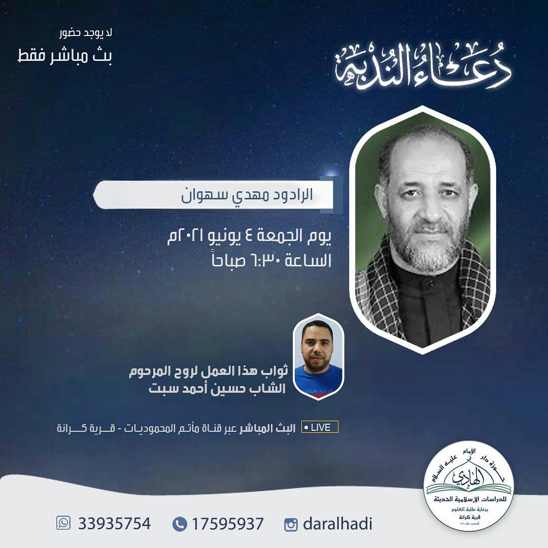 ليلا مع الخطيب الشيخ علي الشغل الساعة ٨ مساء صباح الوفاة السيد هاشم الكربابادي الساعة ١ ظهرا