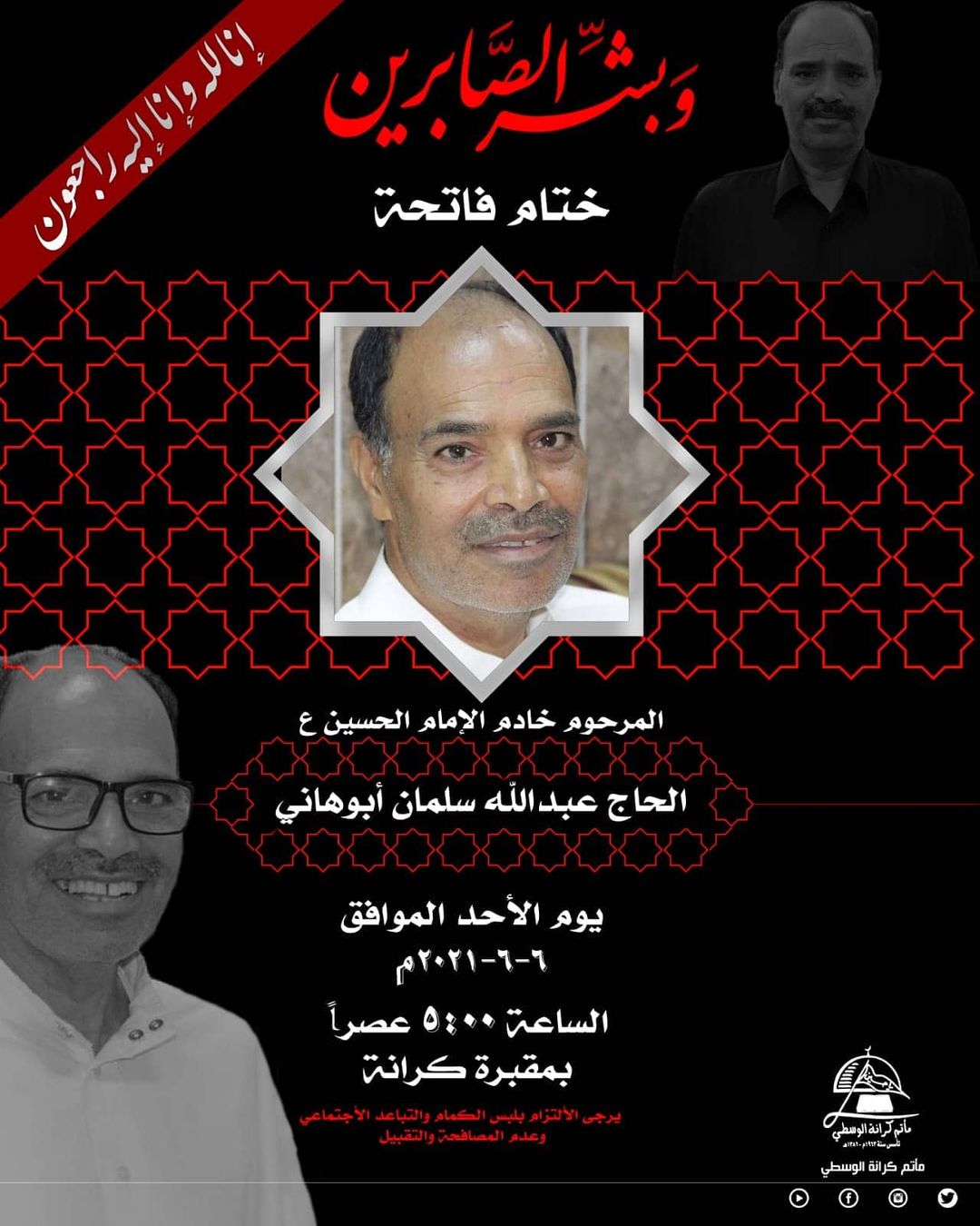 اليوم السبت 5/6/2021ا ختام عزاء الحاج علي عبد الوهاب البصري مقبرة كرانة زمبيان الساعة 5:30 الحضور مع التباعد الاجتماعي