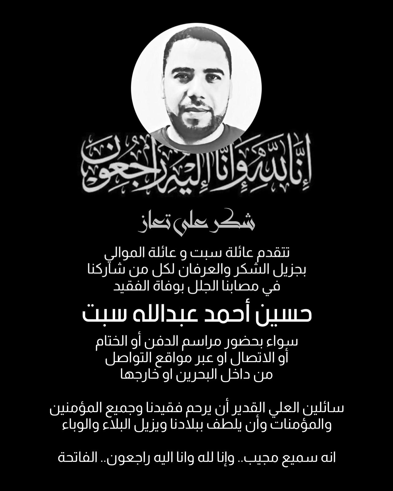 عائلة الوداعي بكرانة تنعى فقيدها الغالي السيد علي سيد شبر الوداعي والفقيد ابن عمة وخالة ومتزوج من عائلة مبارك المرحوم…