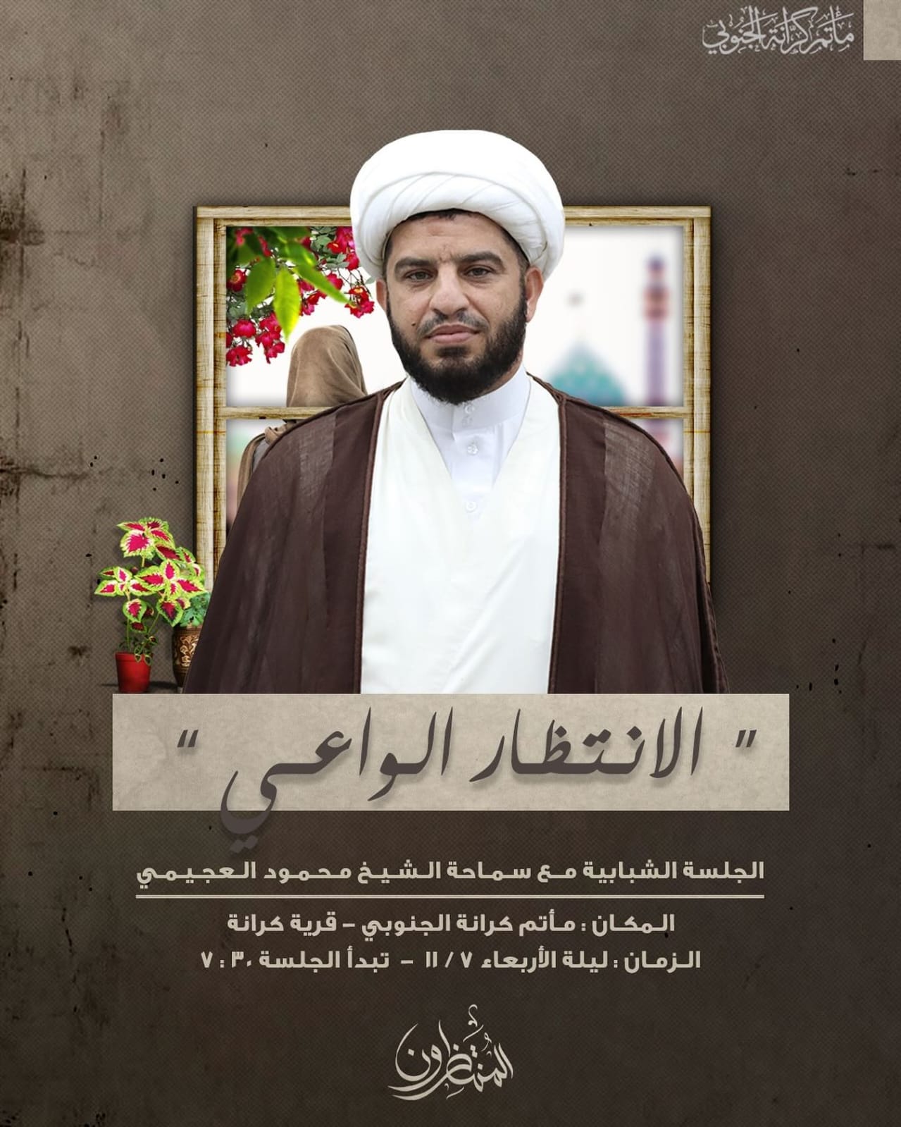 ” الانتظار الواعي الجلسة الشبابية مع سماحة الشيخ محمود العجيمي المكان : مأتم كرانة الجنوبي – قرية كرانة الزمان :…