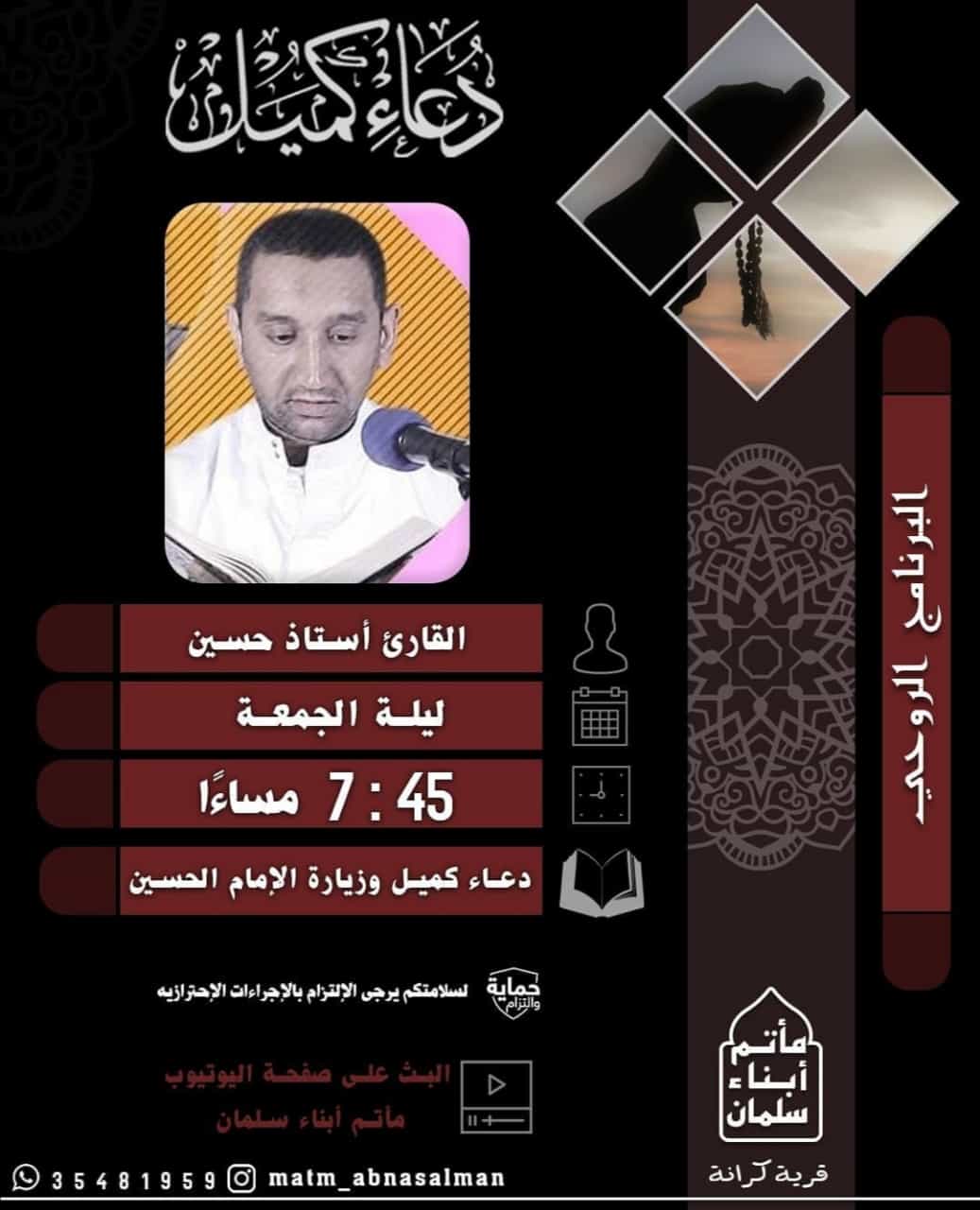 البرنامج الروحي الرادود حسن حمزه ليلة الجمعة 7:30 مساءا دعاء كميل وزيارة الإمام الحسين حماية لسلامتكم يرجى الإلتزام بالإجراءات الإحترازيه والتزام مأتم أبناء سلمان البث على صفحة اليوتيوب مأتم أبناء سلمان قرية كرانةمواصلة القراءة