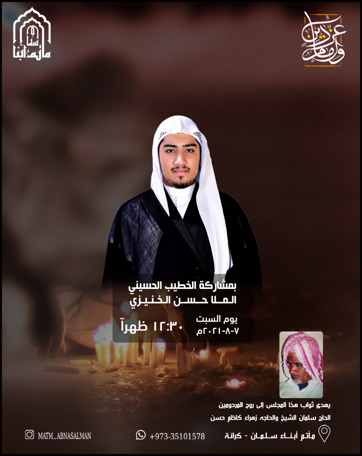 الخطيب الحسيني الملا حسن الخنيزي ۱۲:۳۰ ظهرا ۰۲۱-۸-۷ ام يوم السبت يهدي ثواب هذا المجلس إلى روح المرحومين الحاج سلمان الشيخ والحاجه زهراء كاظم حسن ماتم أبناء سلمان – كرانة الحضور لمن تنطبق عليهم الشروط الصحية بث مباشر على قناة ماتم ابناء سلمان اليوتيوبمواصلة القراءة