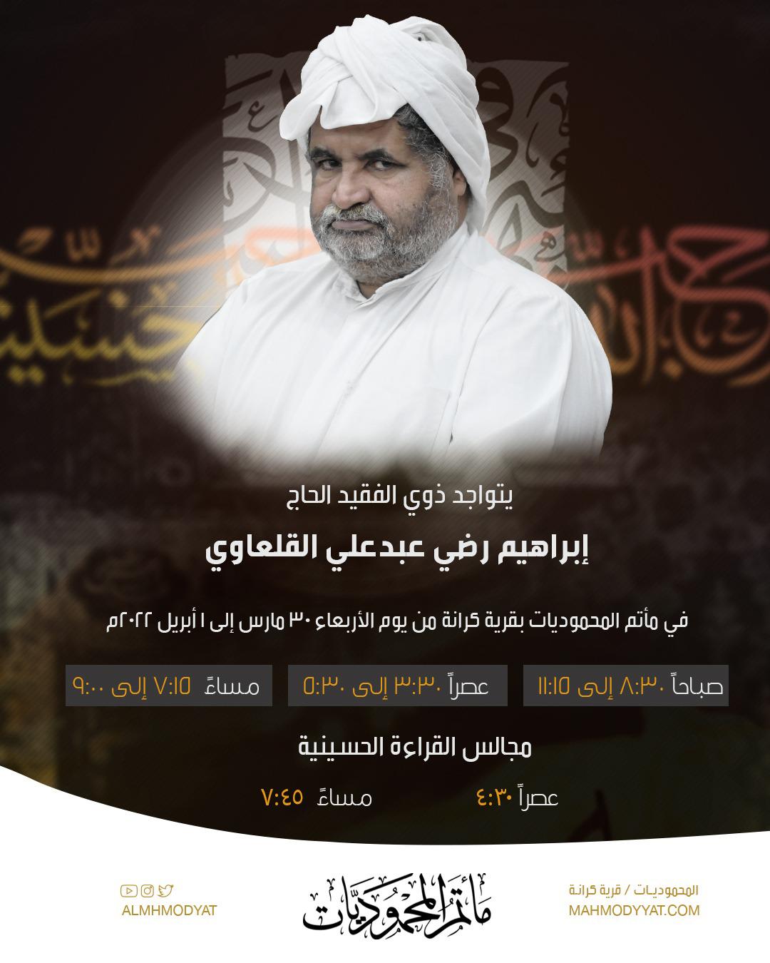 يتواجد ذوي الفقيد الحاج إبراهيم رضي عبدعلي القلعاوي في مأتم المحموديات بقرية كرانة من يوم الأربعاء ٣٠ مارس إلى 1 أبريل ٢٠٢٢م صباحاً ٨:٣٠ إلى 11:10 عصراً ٣:٣٠ إلى 0:٣٠ مساء 7:10 إلى 9:00 مجالس القراءة الحسينية عصراً ٤:٣٠ مساء ٧:٤٥ المحموديات / قرية كرانةمواصلة القراءة