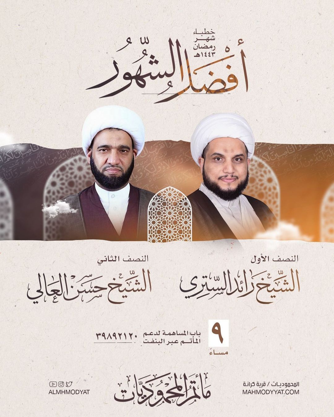 خطبـاء النصف الأول الشيخ رائدالسترى النصف الثاني الشيخ حسين العالي باب المساهمة لدعم ۳۹۸۹۲۱۲۰ المأتـم عبر البنفت مساء المحموديات / قرية كرانةمواصلة القراءة