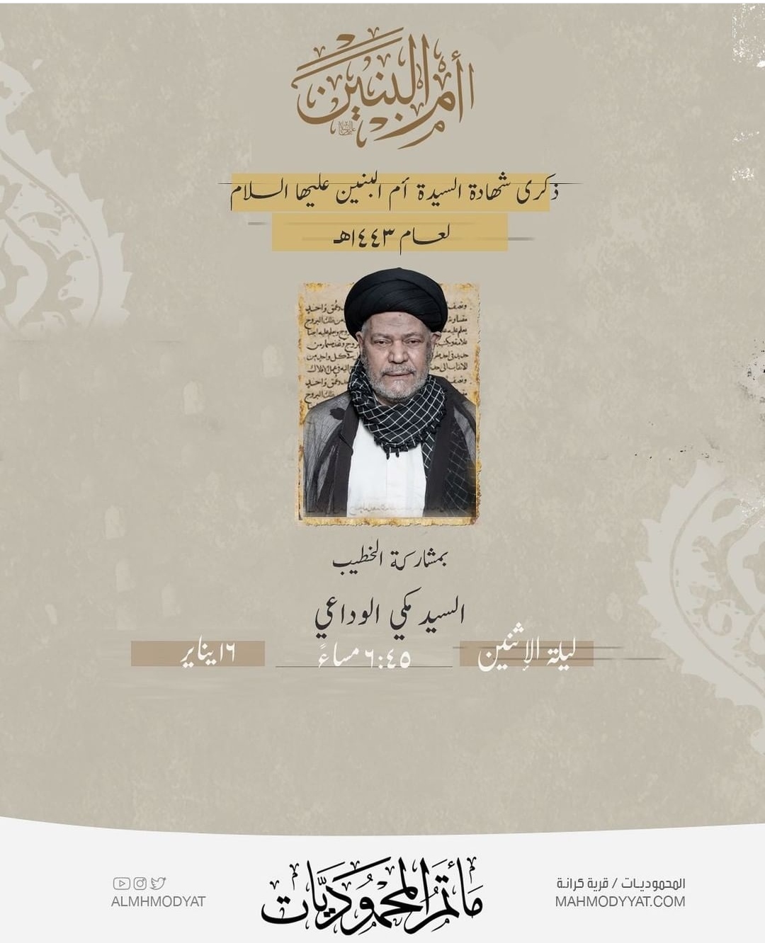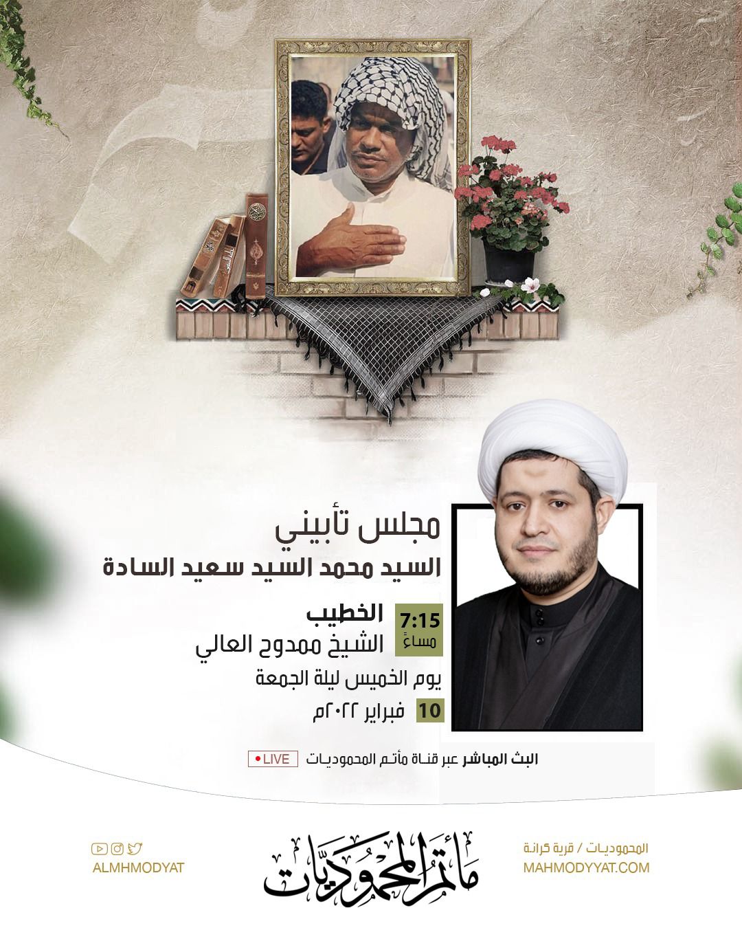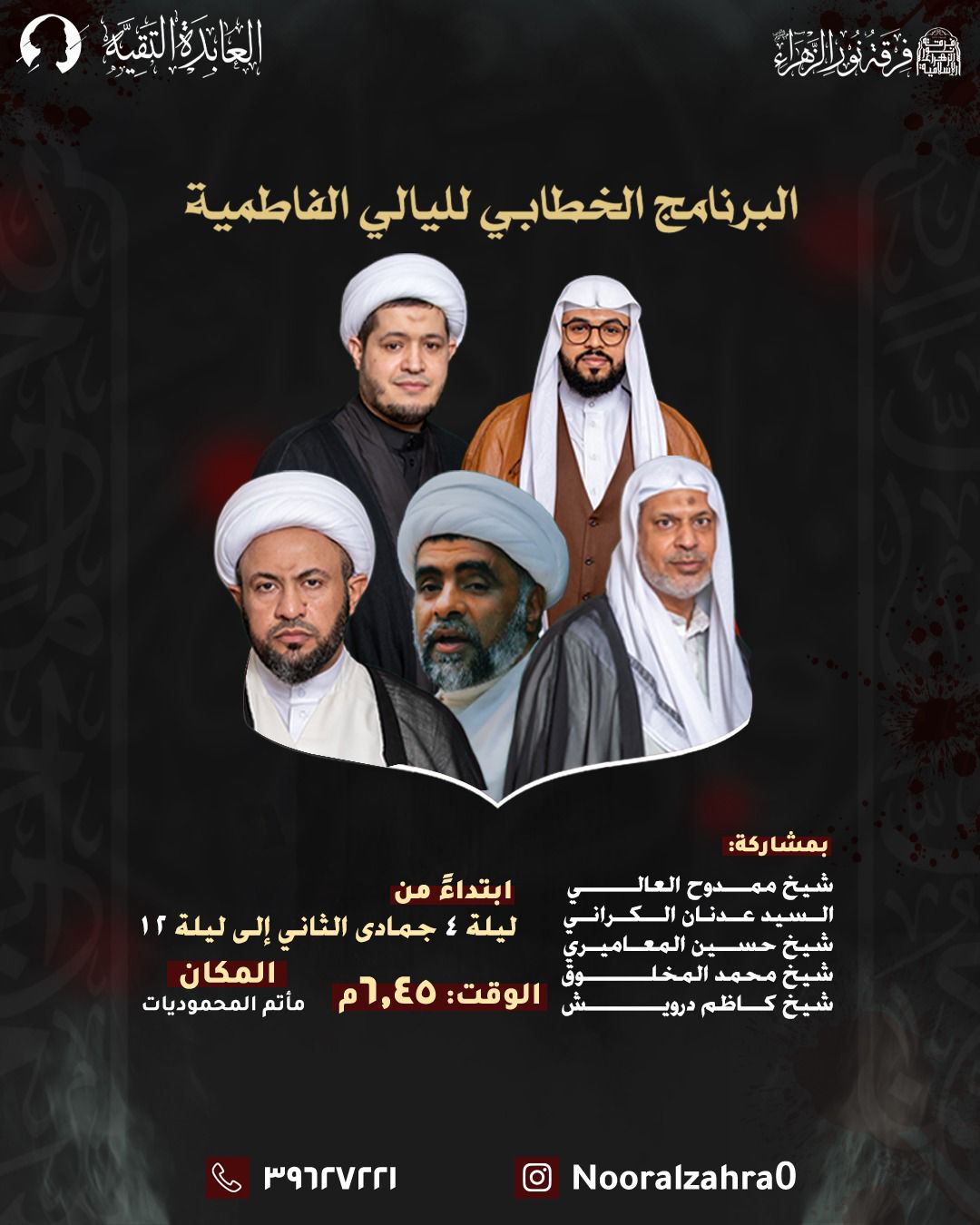 سيد عدنان الكراني الشيخ أحمد المصلي ملا علي الجدحفصي شيخ محمد صالح السيد موسى البلادي إبتداء من ليلة الأربعاء تاريخ 28-12-2021 في تمام الساعه 7:00 مساءاً في مأتم أبناء سلمان يهدى ثواب هذه المجالس إلى روح المرحوم الحاج إبراهيم بن سلمانمواصلة القراءة