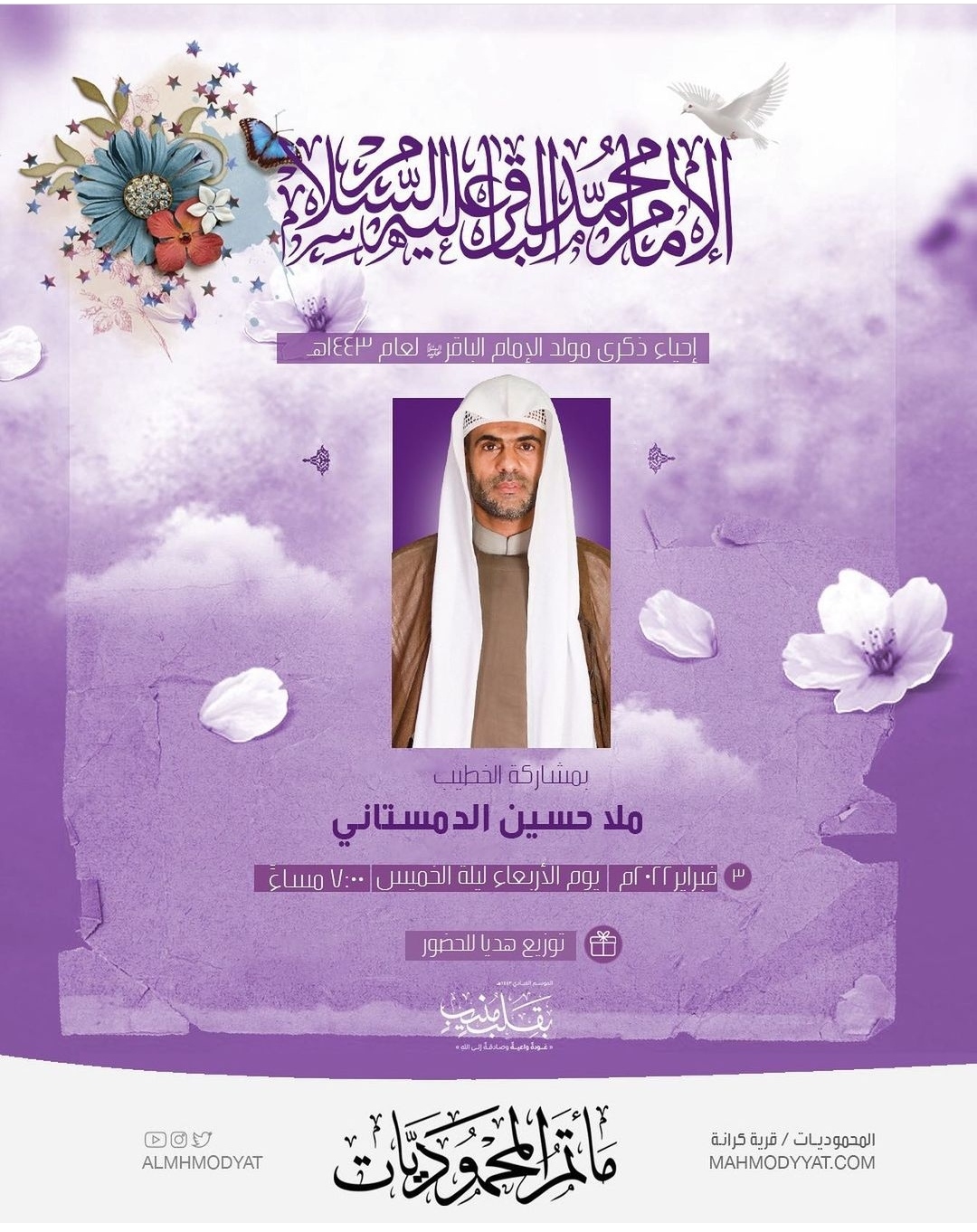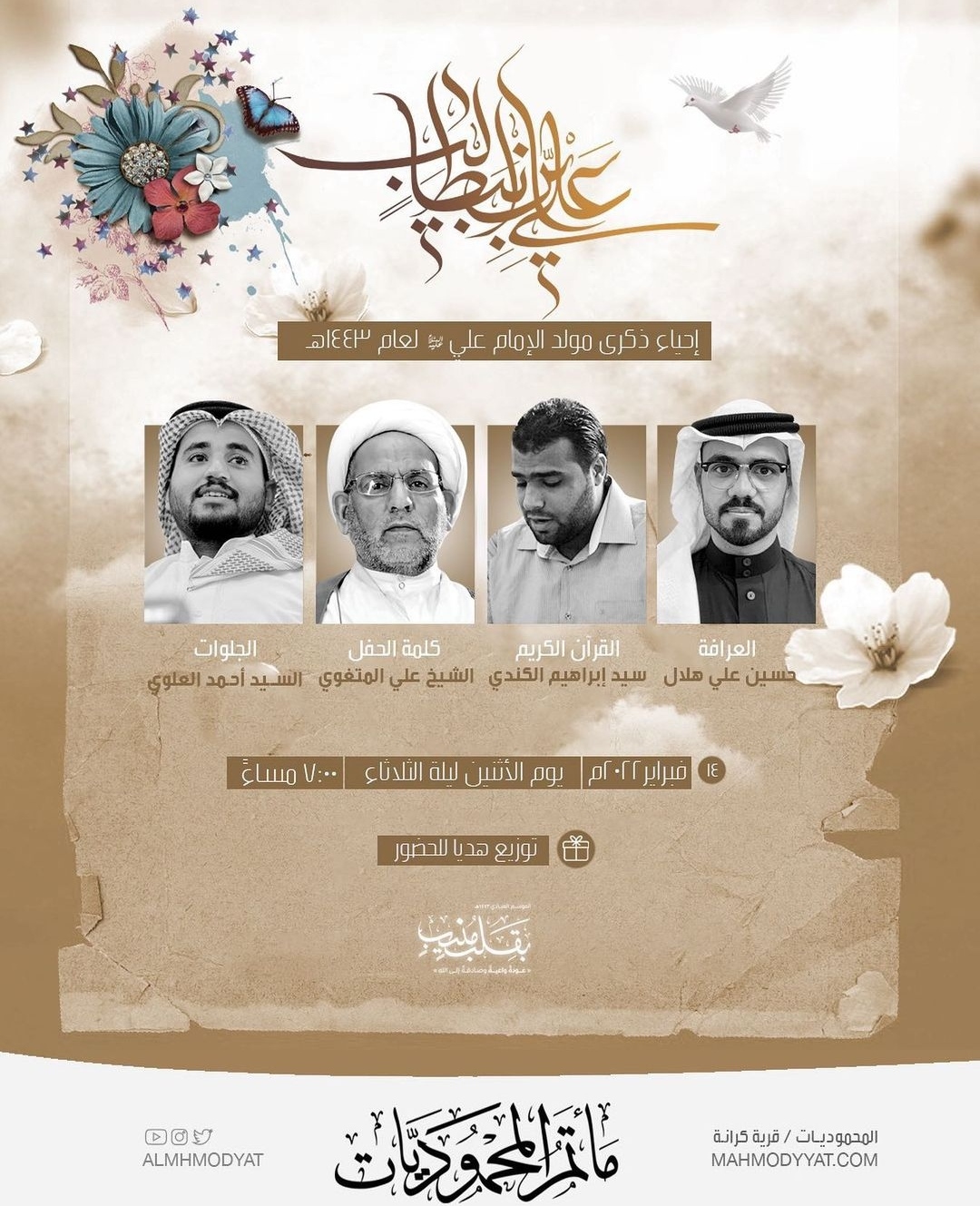 إحياء ذكرى مولد الإمام علي – لعام ١٤٤٣هـ العرافة حسين علي هلال القرآن الكريم سيد إبراهيم الكندي كلمة الحقل الشيخ علي المتغوي السيد أحمد العلوي الجلوات فبراير ٠٢٢ ام يوم الاثنين ليلة الثلاثاء ٧:٠٠ مساءً توزيع هديا للحضور المحموديات / قرية كرانة MAHMODYYAT.COMمواصلة القراءة