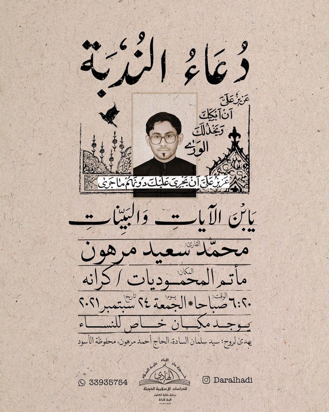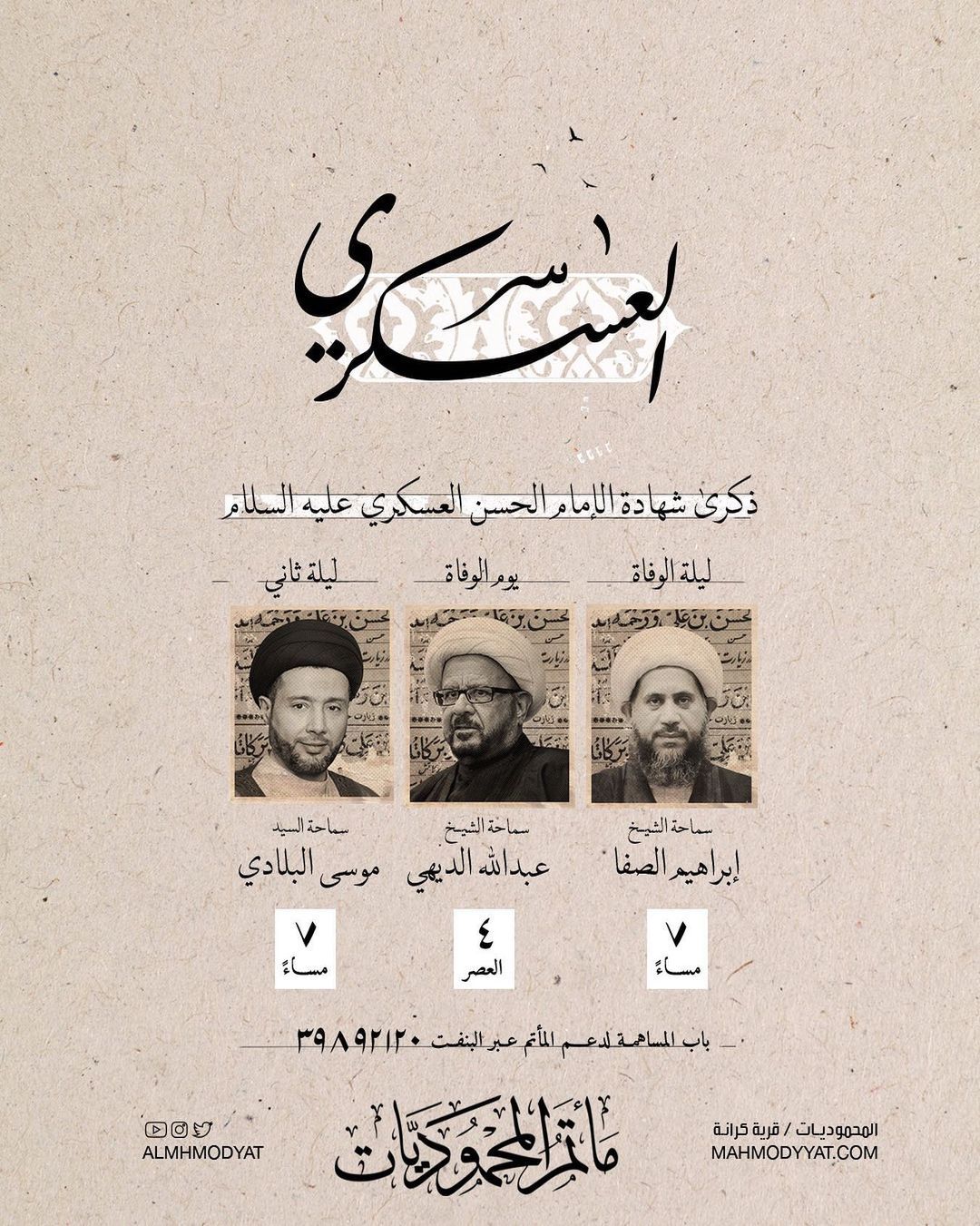 قراءة مولد الإمام الحسن العسكـري عليـه السلام بمشاركة الخطيب الشيخ جميـل الباقـري 13 ) نوفمبر السبت ليلـة الأحد 6:45 مساء – هدايا مميزة للحضور © المحموديات / قرية كرانـةمواصلة القراءة