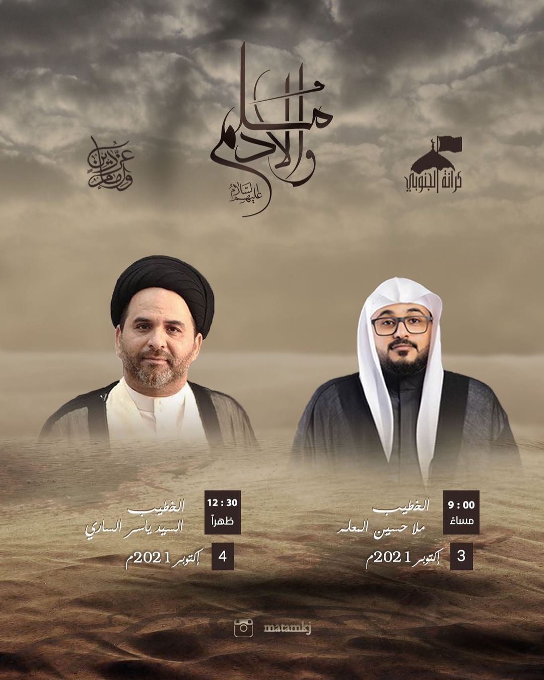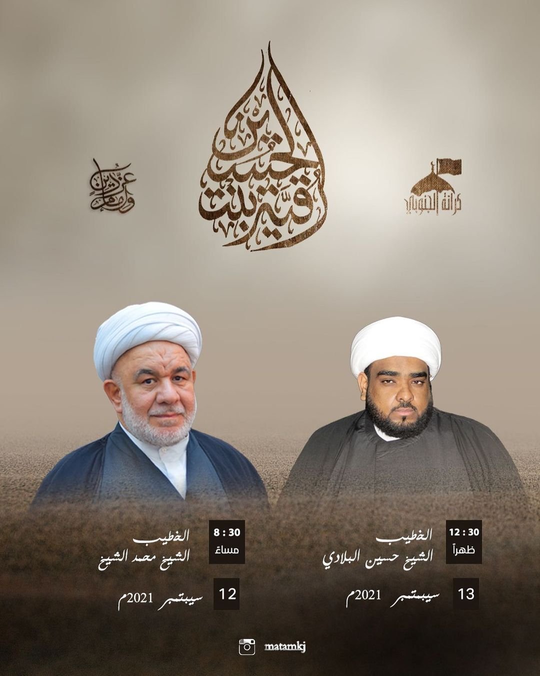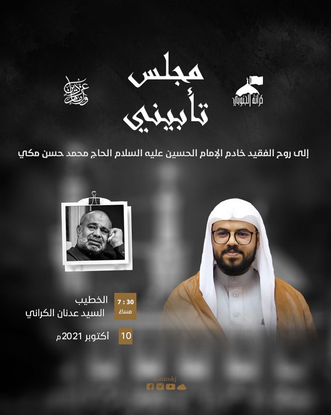 أربعينية المرحوم الحاج محمد حسن مكي ” ابو حسين ” الذكرى السنوية الأولى للمرحومه الحاجة مريم حسن سبت حرم الحاج علي أحمد ام حسين الخطيب ملا محمد المخلوق يوم الخميس ليله الجمعة ۳.۳ | / || / ۱۸ ماتم كرانه الجنوبي الساعة : 7.30 مساء قراءة القران الكريم الساعة 7.00مواصلة القراءة