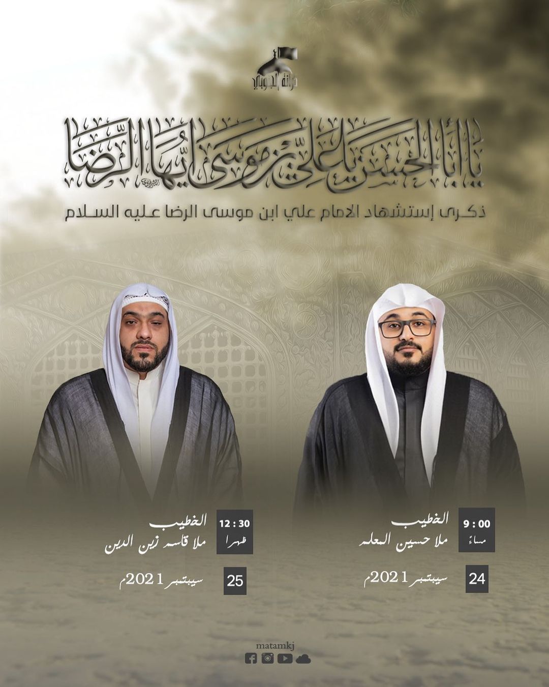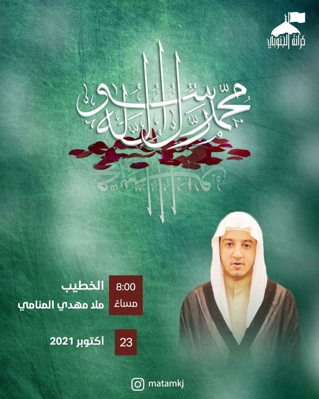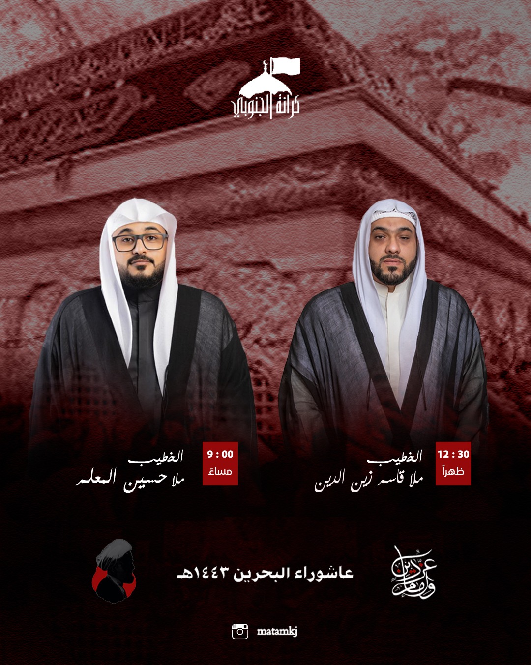 أربعينية المرحوم الحاج محمد حسن مكي ” ابو حسين ” الذكرى السنوية الأولى للمرحومه الحاجة مريم حسن سبت حرم الحاج علي أحمد ام حسين الخطيب ملا محمد المخلوق يوم الخميس ليله الجمعة ۳.۳ | / || / ۱۸ ماتم كرانه الجنوبي الساعة : 7.30 مساء قراءة القران الكريم الساعة 7.00مواصلة القراءة