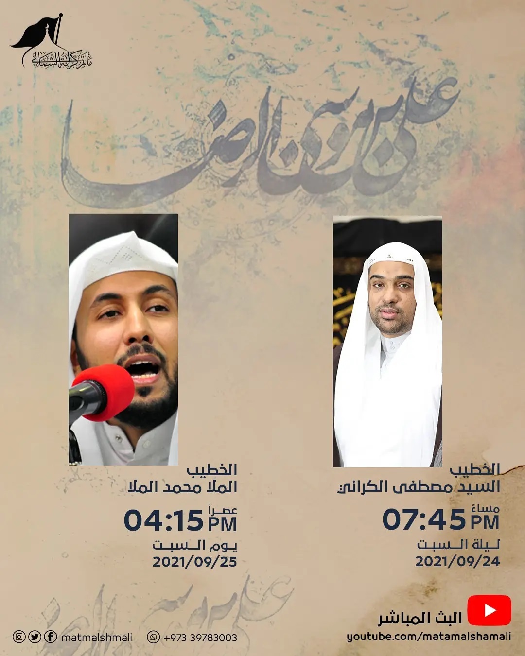 هجرية السيد مصطفى الكراني 8:00 الملا محمد الملا 4:15 عصرا البث المباشر youtube.com/matamalshamali  مواصلة القراءة