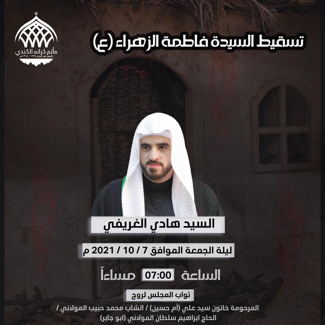 تسقيط السيدة فاطمة الزهراء ( ع ) السيد هادي الغريفي ليلة الجمعة الموافق 7 / 10 / 2021 الساعة 07:00 مساءاً ثواب المجلس لروح المرحومة خاتون سيد علي ( أم حسين ) / الشاب محمد حبيب المولاني / الحاج ابراهيم سلطان المولاني ( ابو جابر ) مأتم كرانه الكندي تاسسمواصلة القراءة