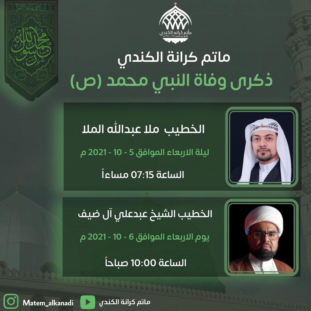 الخطيب سيد محمد الكامل إستشهاد أولاد مسلم يوم الأثنين الموافق 4 – 10 – 2021 م إستشهاد النبي يحي يوم الثلاثاء الموافق 5 – 10 – 2021 م الساعة 10:00 صباحا ماتم کرانة الكنديمواصلة القراءة