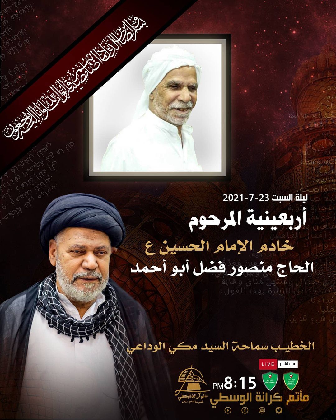 يوم الجمعة ليل السبت الموافق 23/7/2021 اربعين المرحوم الحاج منصور احمد فضل ماتم الوسطي الساعة 8:15 مساء الحضور لمن تنتبق…