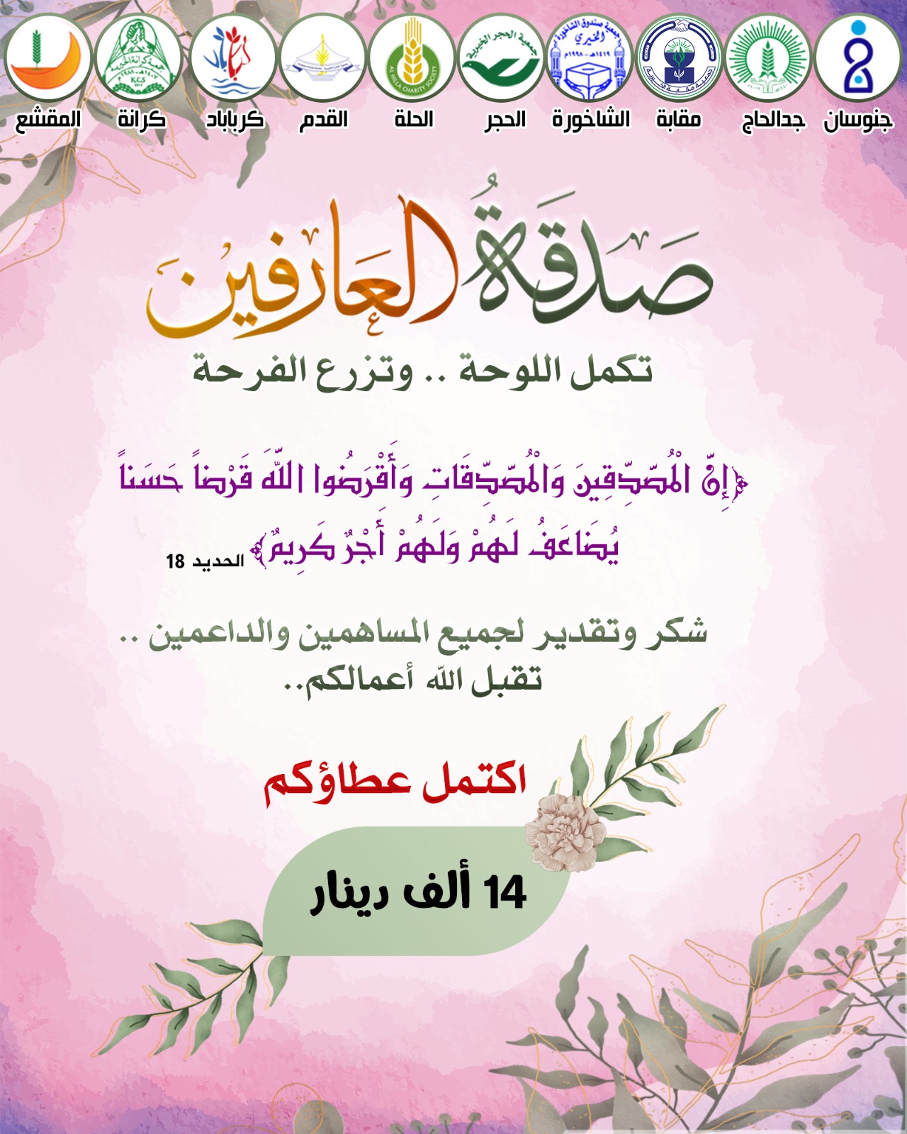 *🌷 اكتمل عطاؤكم 🌷* نتقدم بجزيل الشكر والعرفان لجميع المساهمين والداعمين في حملة صدقة العارفين. تقبل الله منا ومنكم صالح…