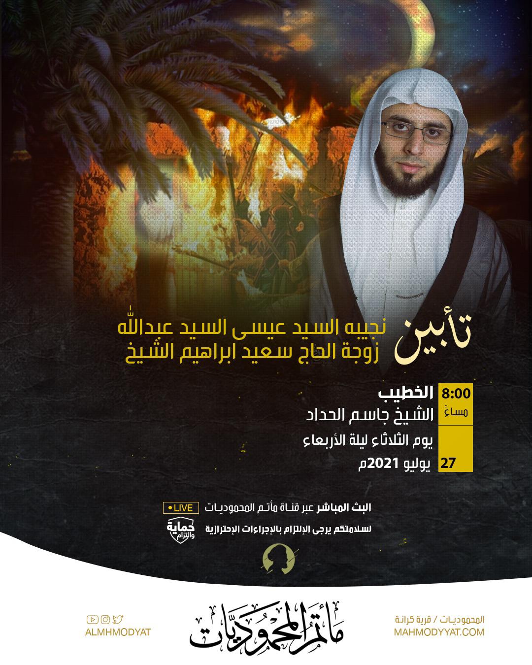 اربعينية السيد نجيبة السيد عيسى ام جمال زوجة الحاج سعيد الشيخ يوم الثلثاء ليلة الاربعاء 27/7/2021 ماتم المحموديات يوجد بث…