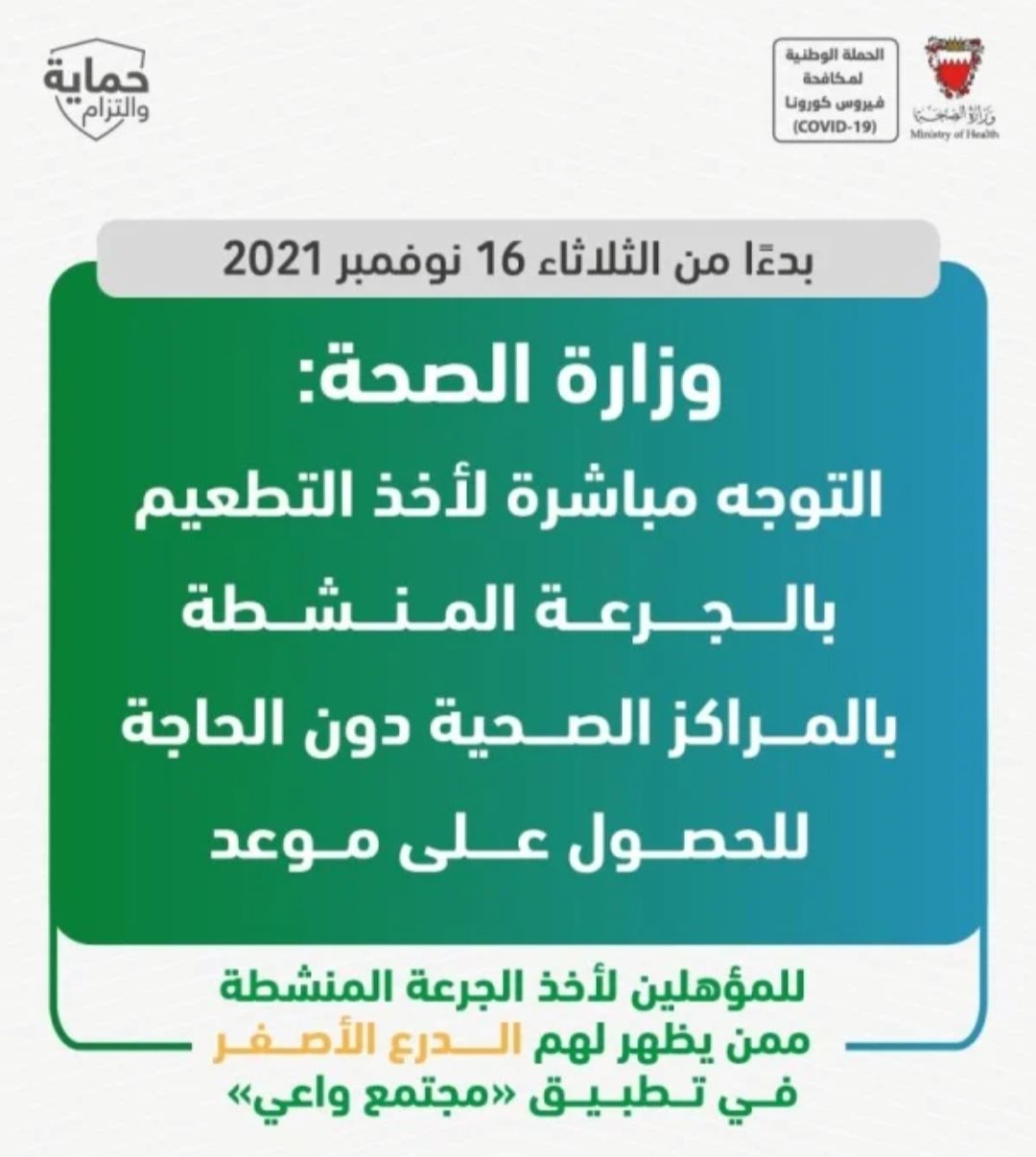 بدءا من الثلاثاء 16 نوفمبر 2021 وزارة الصحة : التوجه مباشرة لأخذ التطعيم بـالـجـرعـة المـنـشـطة بالمـراكز الصـحية دون الحاجة للحصـول…