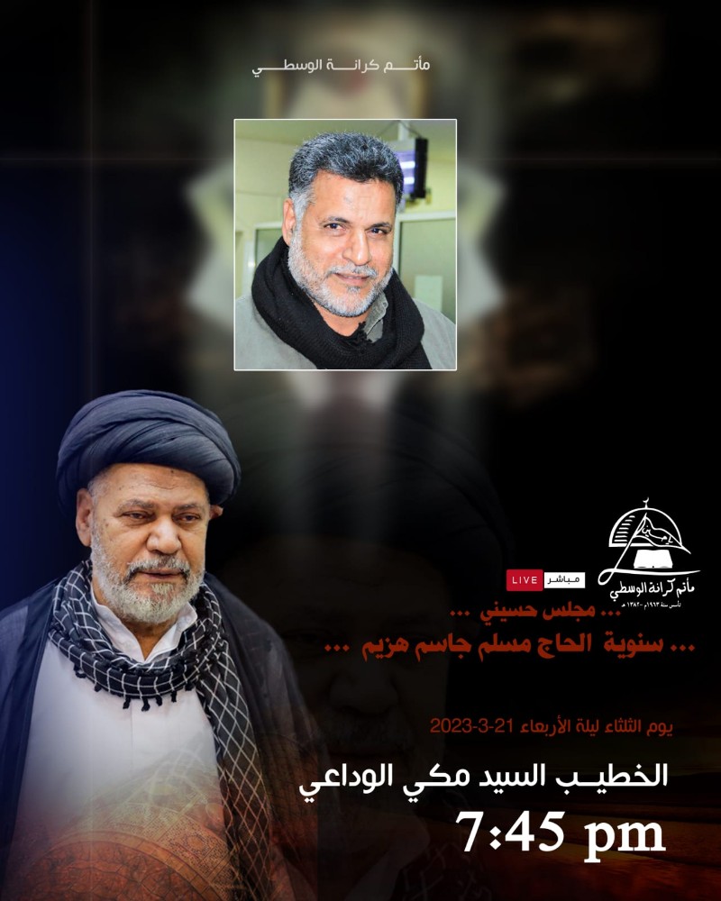 مأتم كرانة الوسطي – . مجلس حسيني سنوية الحاج مسلم جاسم هزیم … يوم الثلثاء ليلة الأربعاء 21-3-2023 الخطيب السيد…