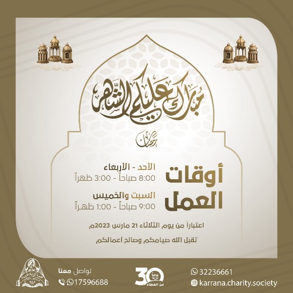 أوقات العمل بمناسبة قرب حلول شهر رمضان المبارك اعتباراً من يوم غد الثلاثاء الموافق ٢١ مارس ٢٠٢٣ م.