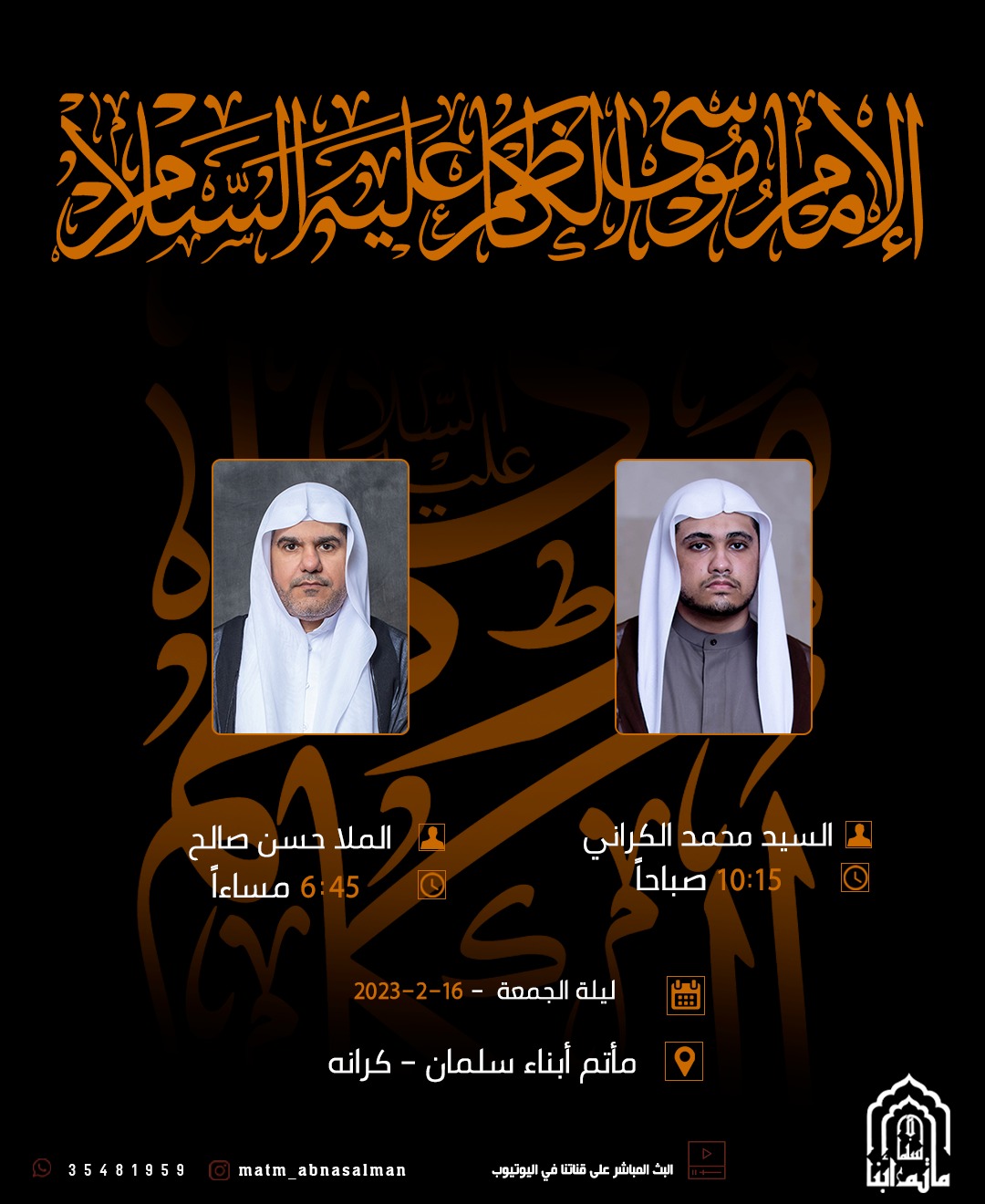 ملا حسن الصالح الساعة 6:45 مساء السيد محمد مكي الساعة 10:15 صباحا ماتم ابناء سلمانة كرانة البحرين