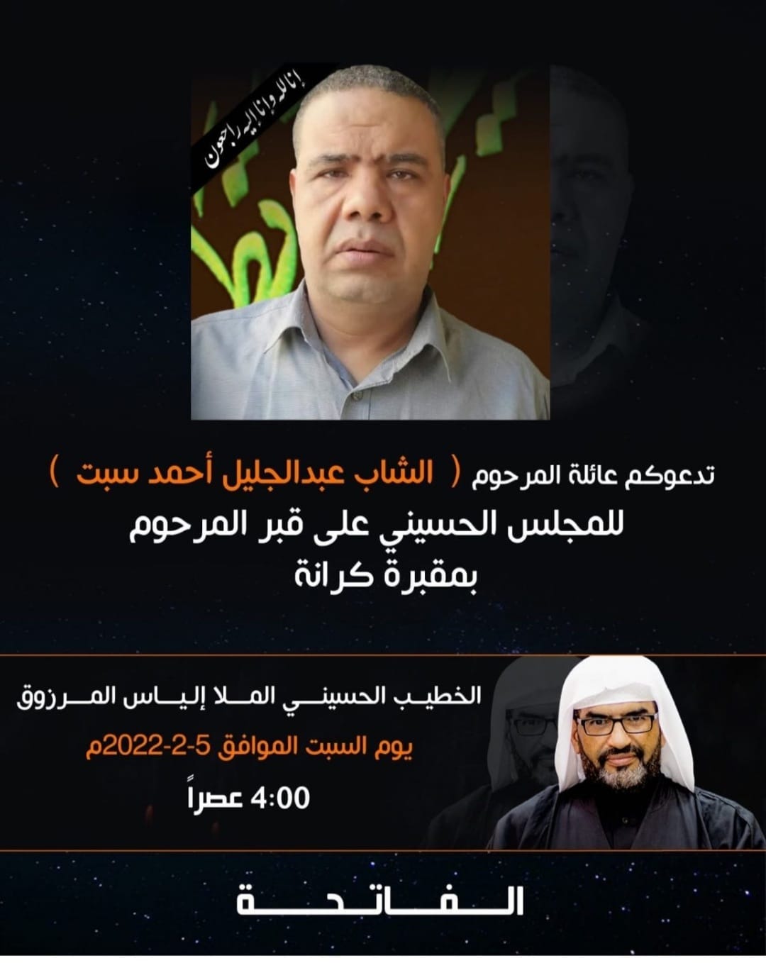 تدعوكم عائلة المرحوم الشاب عبد الجليل احمد سبت لحضور مجلس حسيني في مقبرة كرانة يوم السبت الخطيب ملا الياس المرزوقمواصلة القراءة