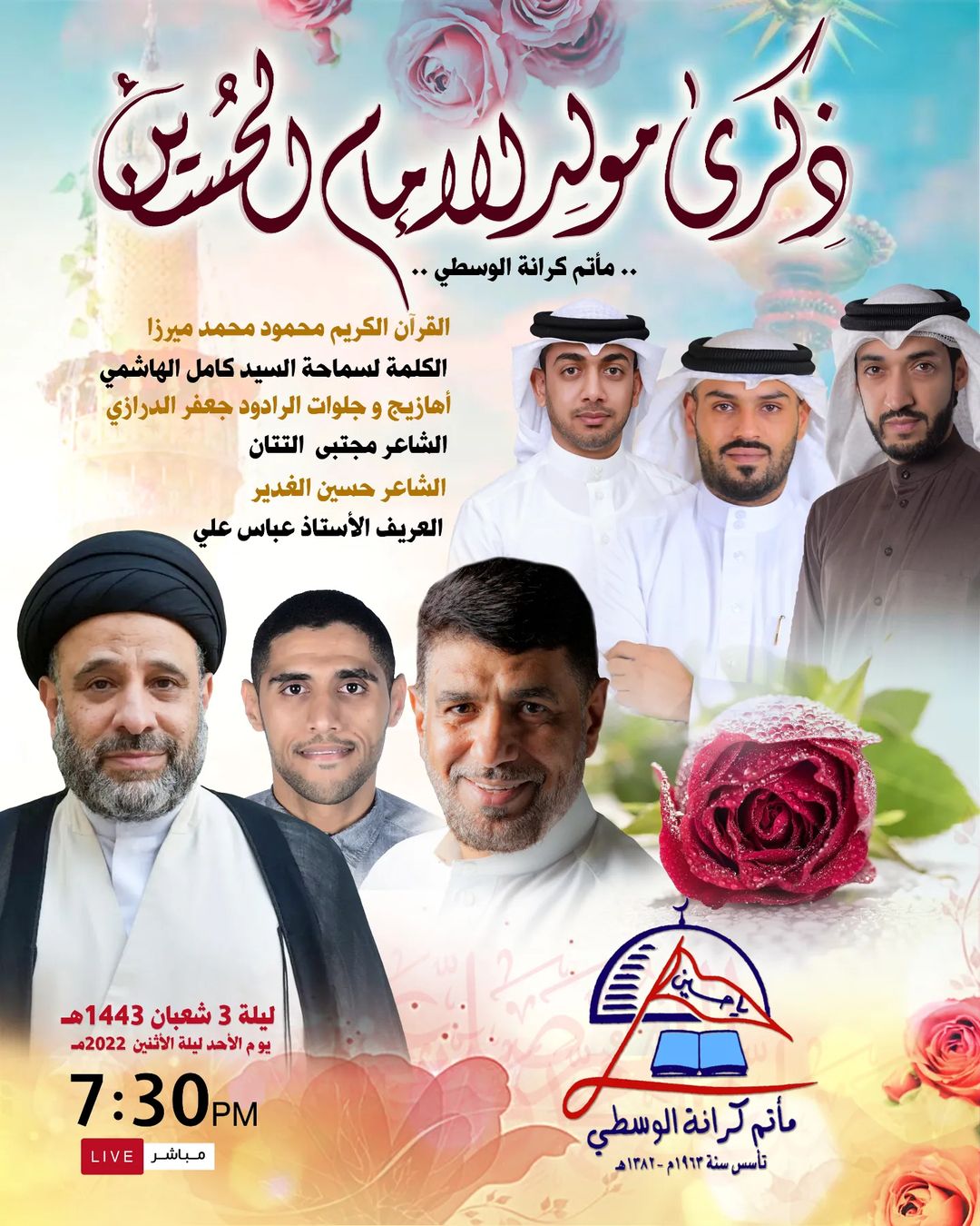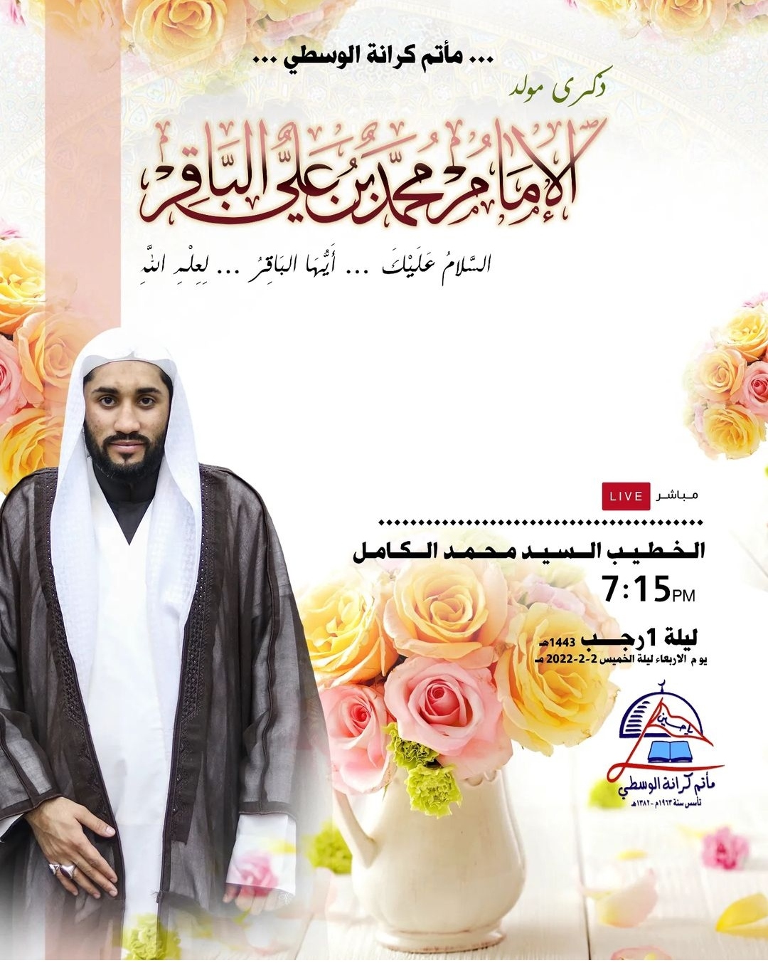 ماتم كرانة الوسطي مولد الامام الباقر ع يقيم احتفال مع الخطيب السيد محمد الكامل الساعة 7:15 ليلة الخميس 1 رجب 1443 هجريمواصلة القراءة