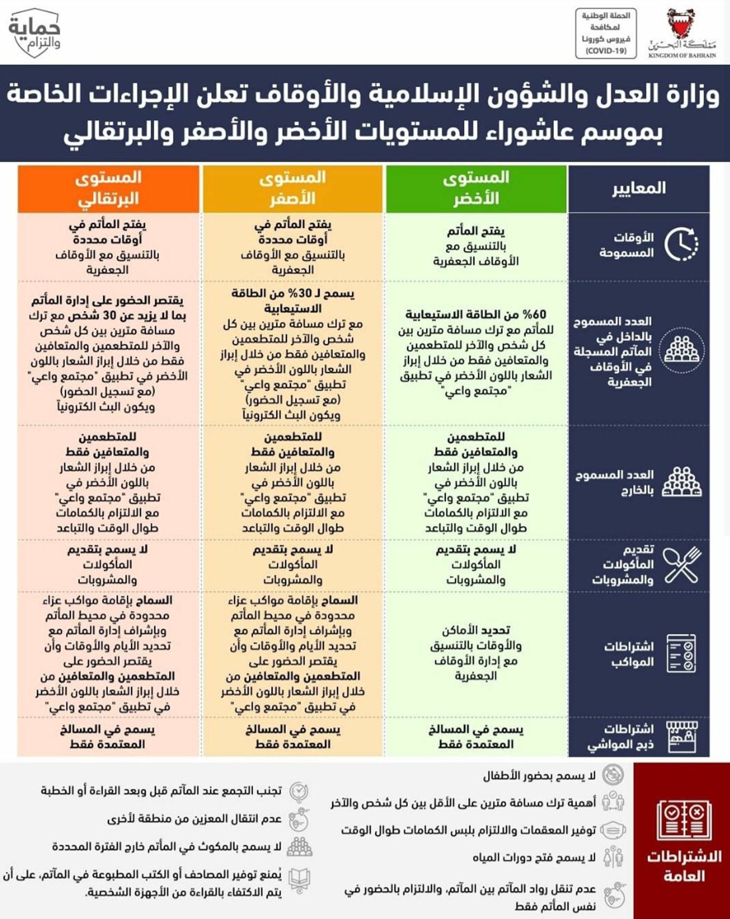 العدل تعلن الإجراءات الخاصة بموسم عاشوراء للمستويات الأخضر والأصفر والبرتقالي للمستويات الأخضر والأصفر والبرتقالي بما يسهم في دعم كافة الجهود الوطنية للحد من انتشار الفيروس وحفاظاً على صحة وسلامة الجميع، وهي كالتالي: الإجراءات المتعلقة بالمآتم في المستوى الأخضر: يفتح المأتم بالتنسيق مع إدارة الأوقاف الجعفرية. يسمح لـ60% من الطاقة الاستيعابيةمواصلة القراءة