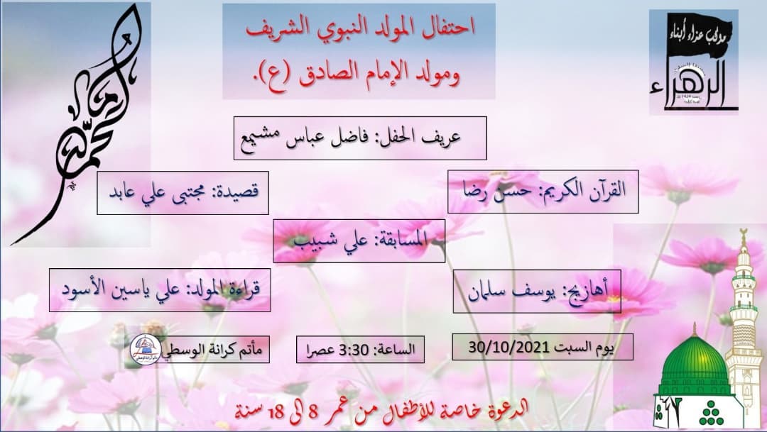يعلن موكب أبناء الزهراء ( ع ) عن فتح باب التسجيل في برنامج مع الحسين لإعداد الرواديد الناشئة في قرية كرانة من عمر 8 وحتى 15 سنة في الفترة من تاريخ 31-24 ديسمبر 2021 استمارة التسجيل https://docs.google.com/forms/d/e/1FAIpQLScDOaduHiqM6FQuwa9PqgY6q7keLlHcxl1MBUqiAmmlULgD8A/viewform عزاء أبناءالزهراء مع الحسينمواصلة القراءة