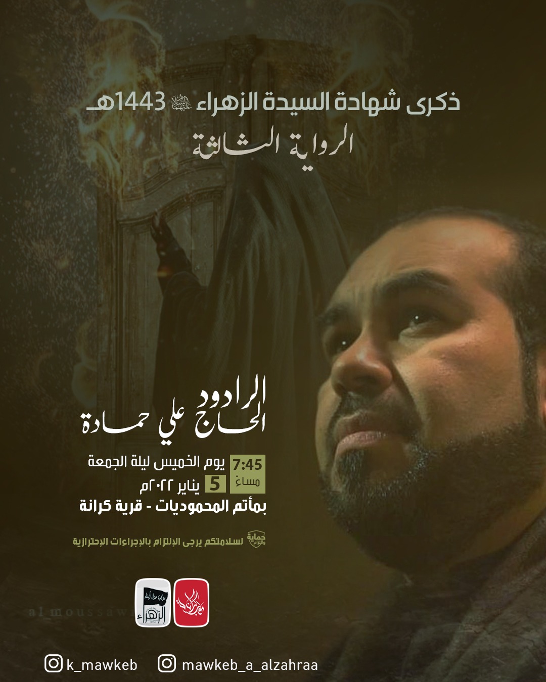 ذكرى شهادة السيدة الزهراء – 1443هـ الرواية الثالثة الرادود علي حمادة |7:45  يوم الخميس ليلة الجمعة مساء 5 يناير ٢٠٢٢م بمأتم المحموديات – قرية كرانة حماية السلامتكم يرجى الإلتزام بالإجراءات الإحتراريةمواصلة القراءة