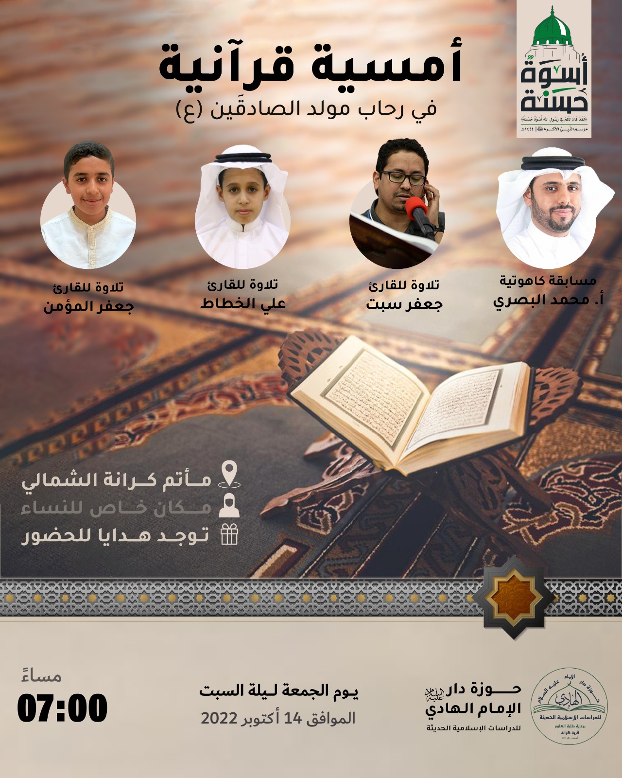 🤲 | الأُمسِياتُ القُرآنيّة الأمسية الثانية.. بمشاركة | القارئ يوسف حمادي بمشاركة | القارئ محمود المحروق بمشاركة | القارئ محمود الاسكافي 🌙 | ليلة 10 رمضان.. 📅 | الجمعة ليلة السبت | 2026/2/27مـ 🕐 | 11:00 مساءً 📍 | مأتم كرانة الشمالي – قرية كرانة 🎁 | توجد جوائز للحضورمواصلة القراءة