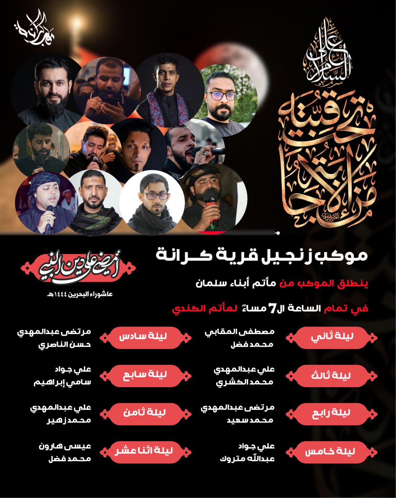 لجنة موكب الرادود علي جواد الرادود سيد جعفر الموسوي موكب الزنجيل المركزي 5:00 يوم الثلاثاء بمشاركة قرى عصرا | المقشمع – كرانة وادي السلام – حلة العبد الصالح يوم سادس محرم ينطلق الموكب من صالة وادي السلام بالقرب من مطعم دلع كرشكمواصلة القراءة